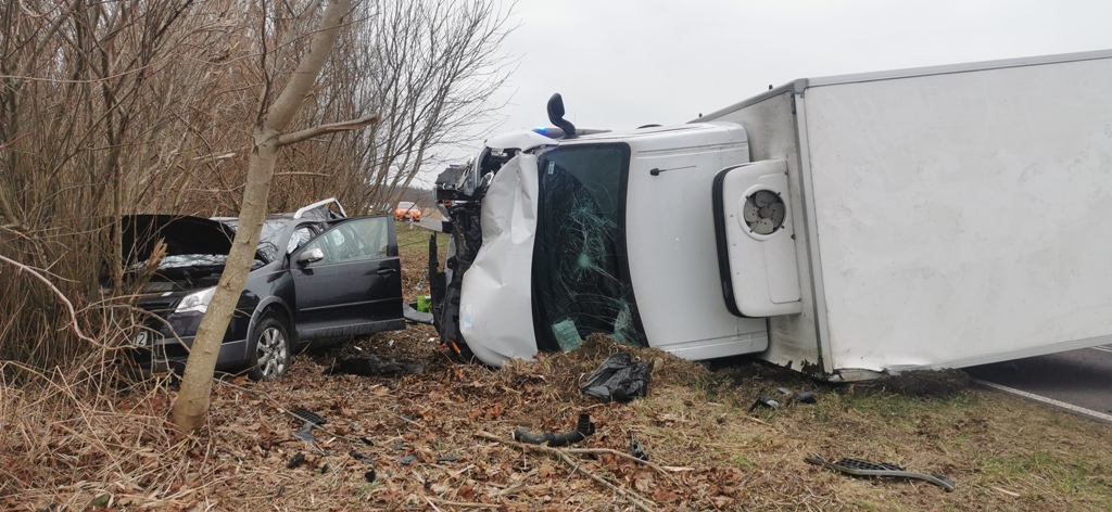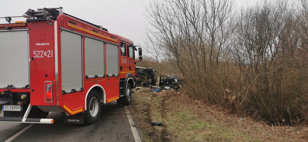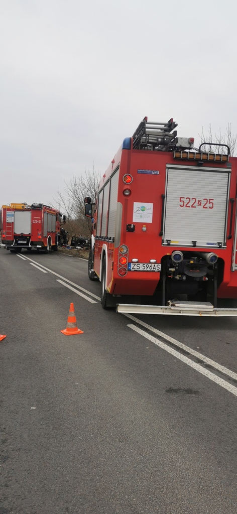 Z chwilą przybycia na miejsce zdarzenia pierwszych zastępów stwierdzono zderzenie dwóch samochodów dostawczego z osobowym, pojazdy znajdowały się poza pasem ruch drogowego. Zabezpieczono miejsce zdarzenia. Dwie osoby poszkodowane z samochodu osobowego po przebadaniu przez Zespoły Ratownictwa Medycznego zostały przetransportowane do szpitala.