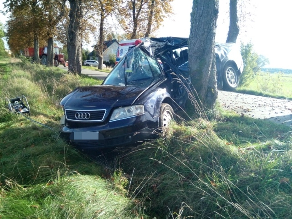 Z chwilą przybycia na miejsce zdarzenia stwierdzono wypadek samochodu osobowego z ciągnikiem rolniczym, w wyniku czego samochód osobowy uderzył w przydrożne drzewo. Pojazdem osobowym podróżowała kobieta, którą strażacy ewakuowali przy użyciu urządzeń hydraulicznych, następnie osoba poszkodowana została przekazana przybyłemu na miejsce zdarzenia Zespołowi Ratownictwa Medycznego. Po przebadaniu osoba poszkodowana została przetransportowana przez ZRM do szpitala.