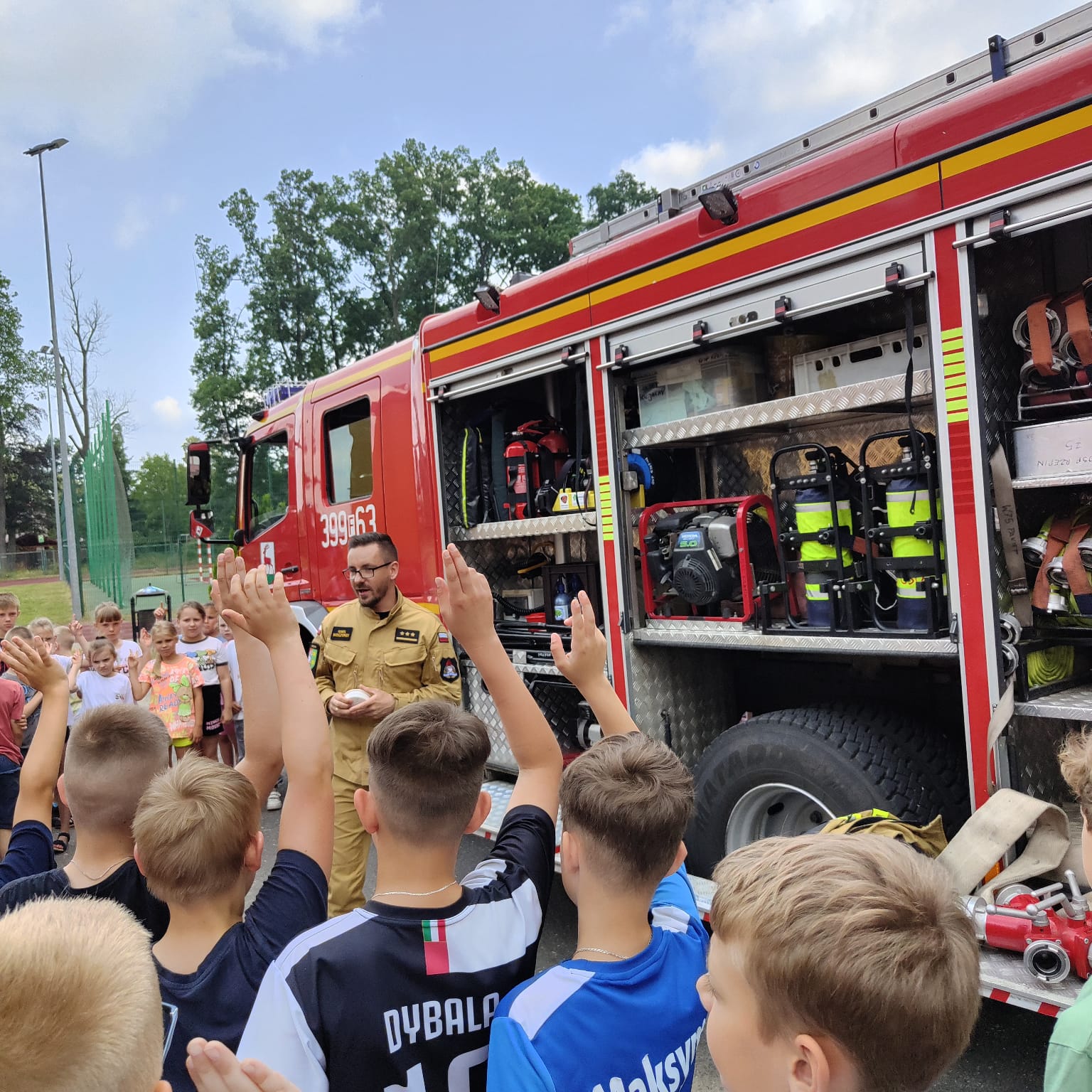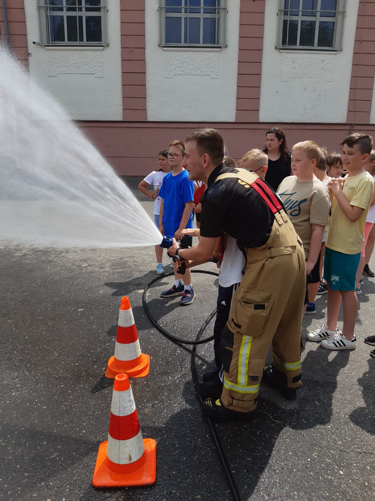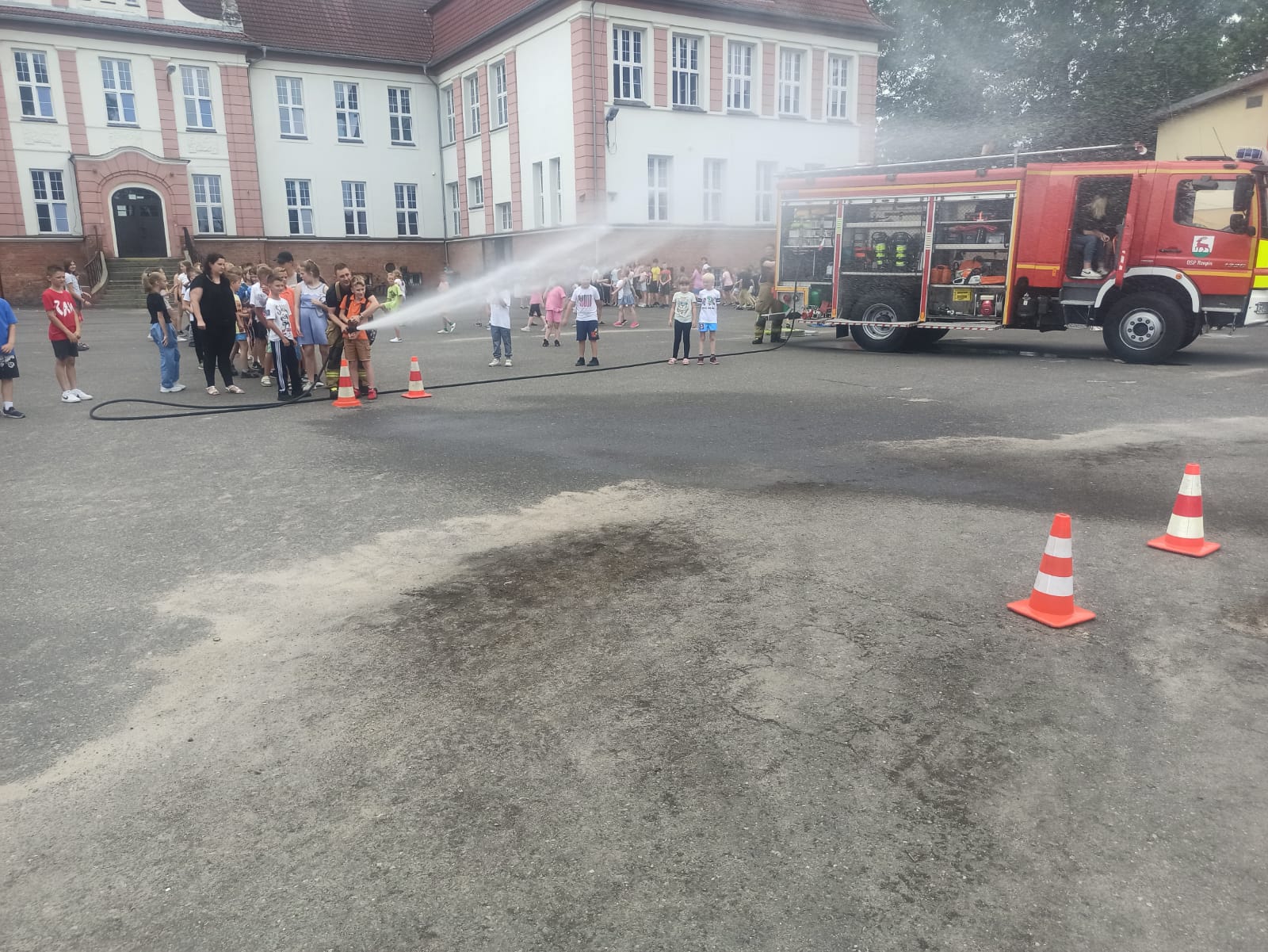W ramach przeprowadzanych zajęć przygotowano również pokaz umundurowania i sprzętu strażackiego, a także dano dzieciom możliwość spróbowania własnych sił przy podawaniu prądów wody z linii szybkiego natarcia.