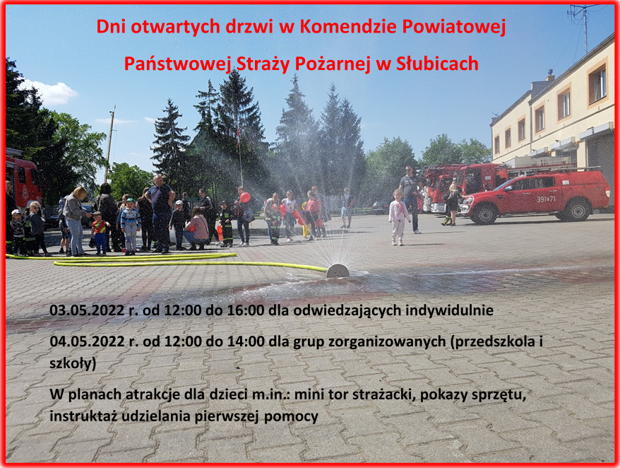 Komenda Powiatowa Państwowej Straży Pożarnej w Słubicach zaprasza wszystkich chętnych – zwłaszcza dzieci i młodzież, do odwiedzenia nas w ramach organizowanych w maju „SŁUBICKICH OTWARTYCH DRZWI STRAŻY POŻARNEJ”. Miło będzie nam Was widzieć po długiej przerwie wynikłej z powodu pandemii Covid -19. Kolejny raz damy Wam możliwość bezpośredniego spotkania ze słubickimi strażakami. Przygotowane atrakcje z pewnością przybliżą Wam specyfikę naszego zawodu. Z myślą o najmłodszych, zorganizowane zostaną m.in.: mini tor strażacki, pokazy sprzętu strażackiego czy instruktaż udzielania pierwszej pomocy. Spotkanie będzie również doskonałą okazją do przedstawienia szerokiego zakresu tematów związanych z bezpieczeństwem, tak więc postaramy się odpowiedzieć na wszystkie pytania dotyczące naszej służby i zasad zachowania bezpieczeństwa w życiu codziennym.