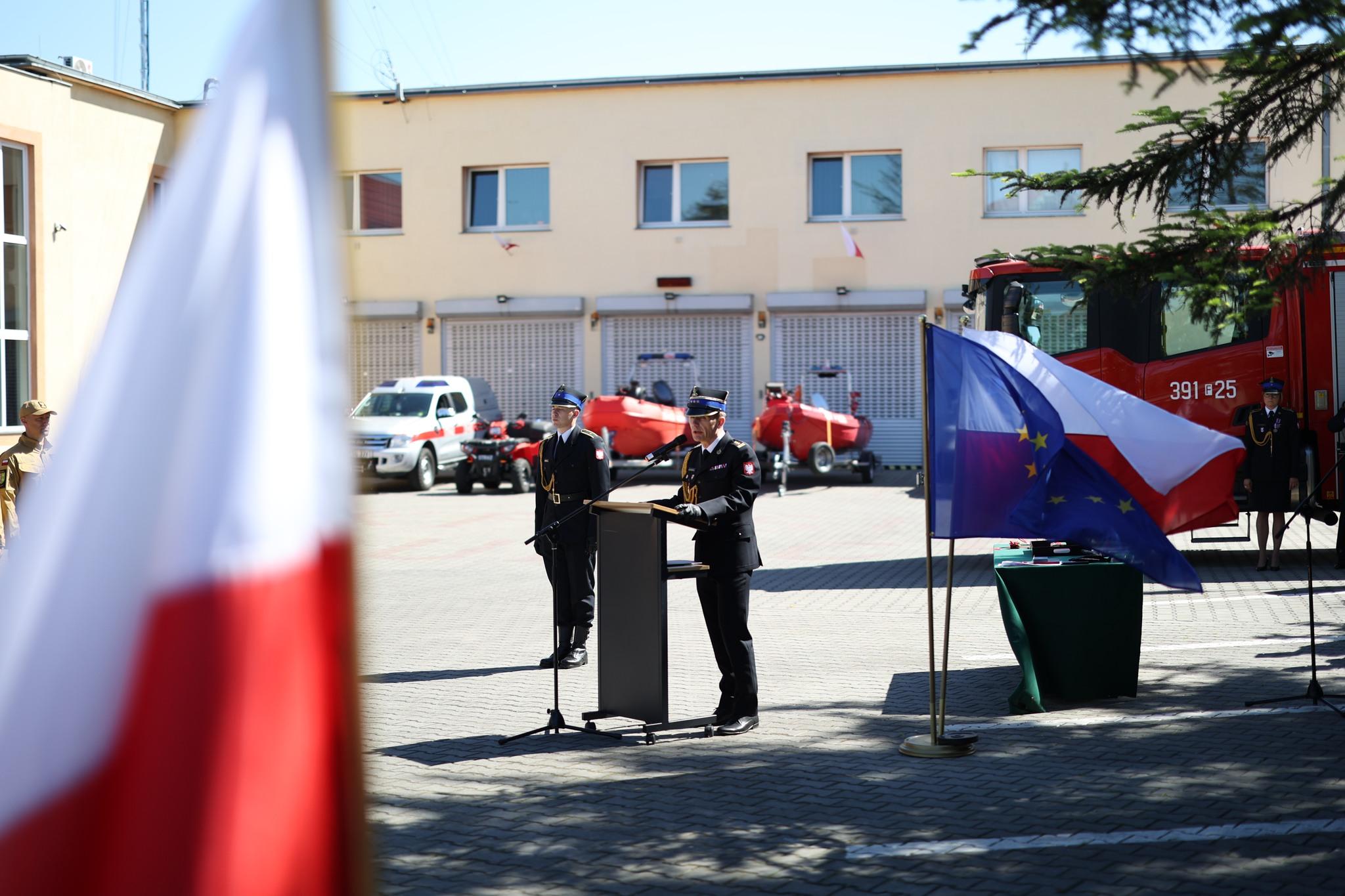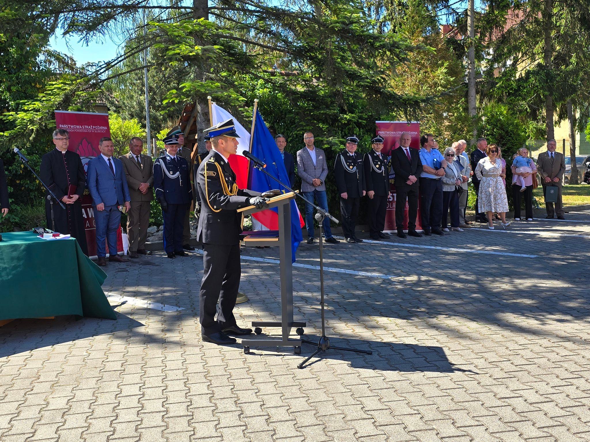 Po podniesieniu flagi państwowej i odegraniu Mazurka Dąbrowskiego, p.o. Komendant Powiatowy PSP w Słubicach bryg. Michał Borowy przywitał uczestników obchodów, w swoim przemówieniu dziękował funkcjonariuszom Państwowej Straży Pożarnej, pracownikom cywilnym oraz członkom Ochotniczych Straży Pożarnych za ich niesłabnące zaangażowanie i wkład w bezpieczeństwo mieszkańców powiatu.