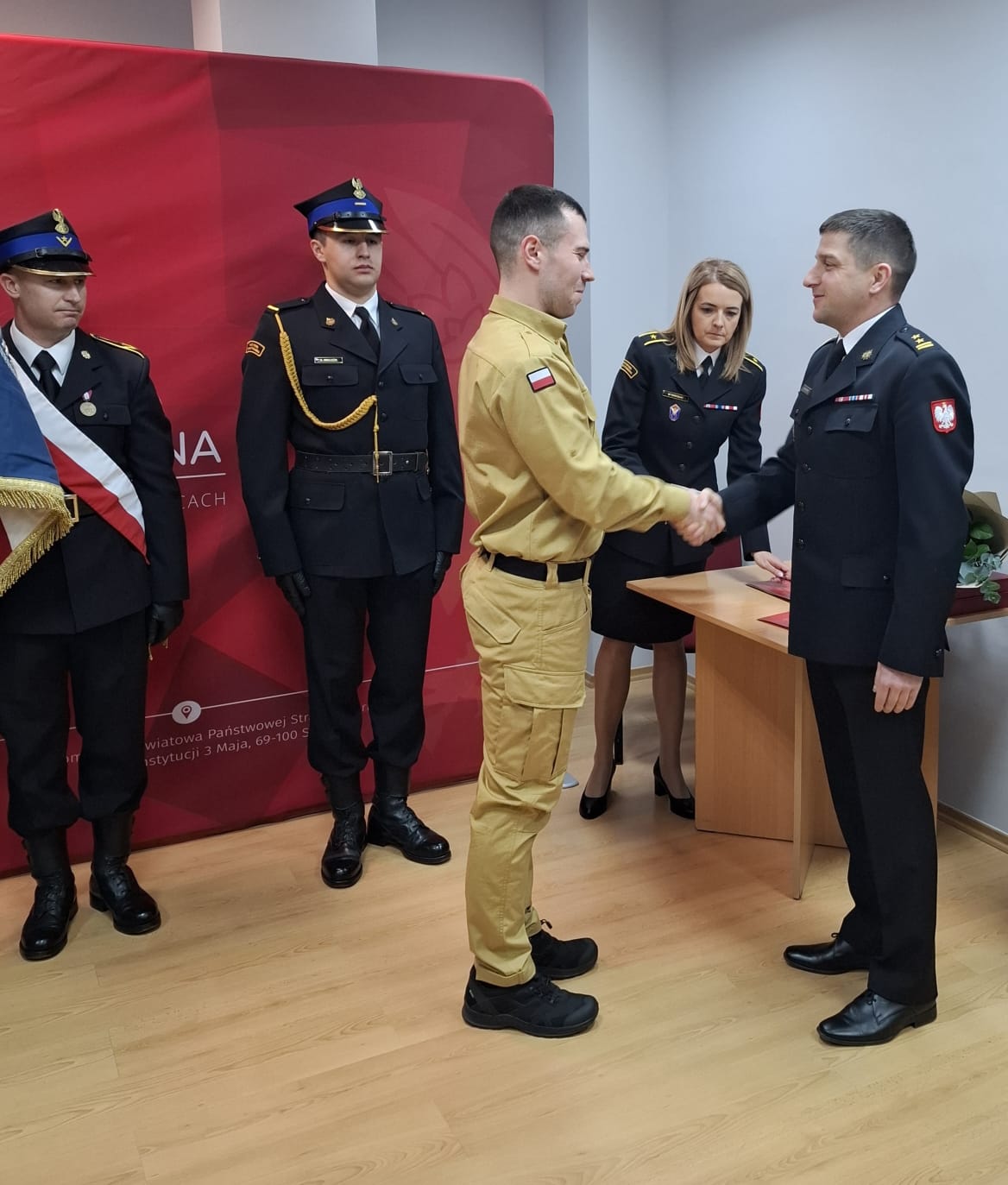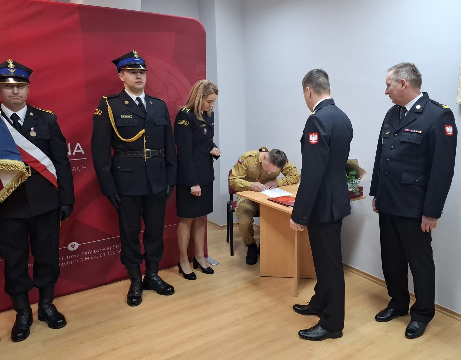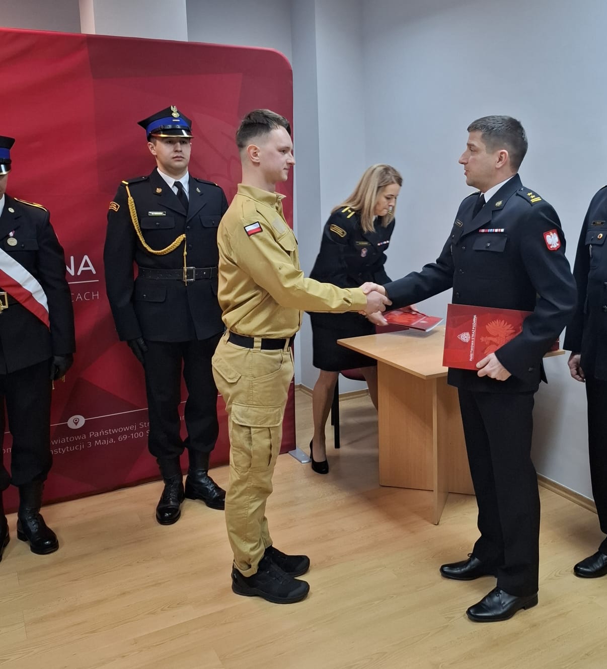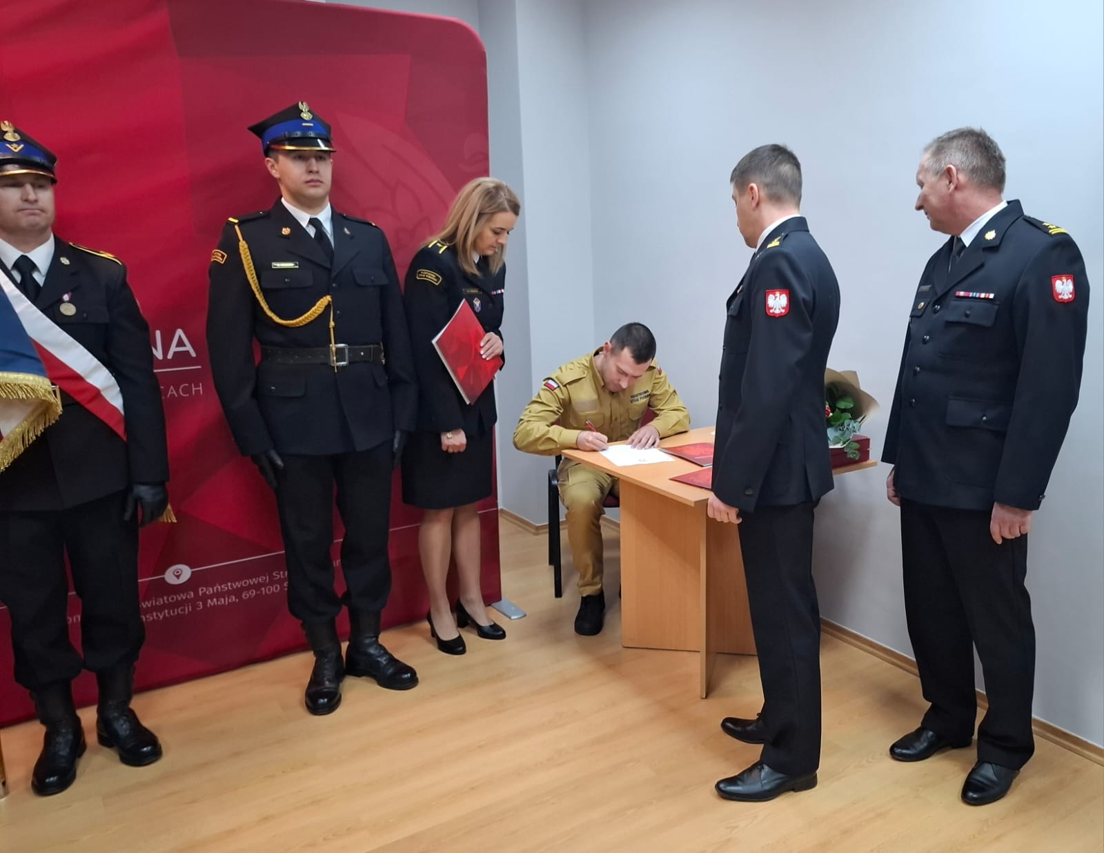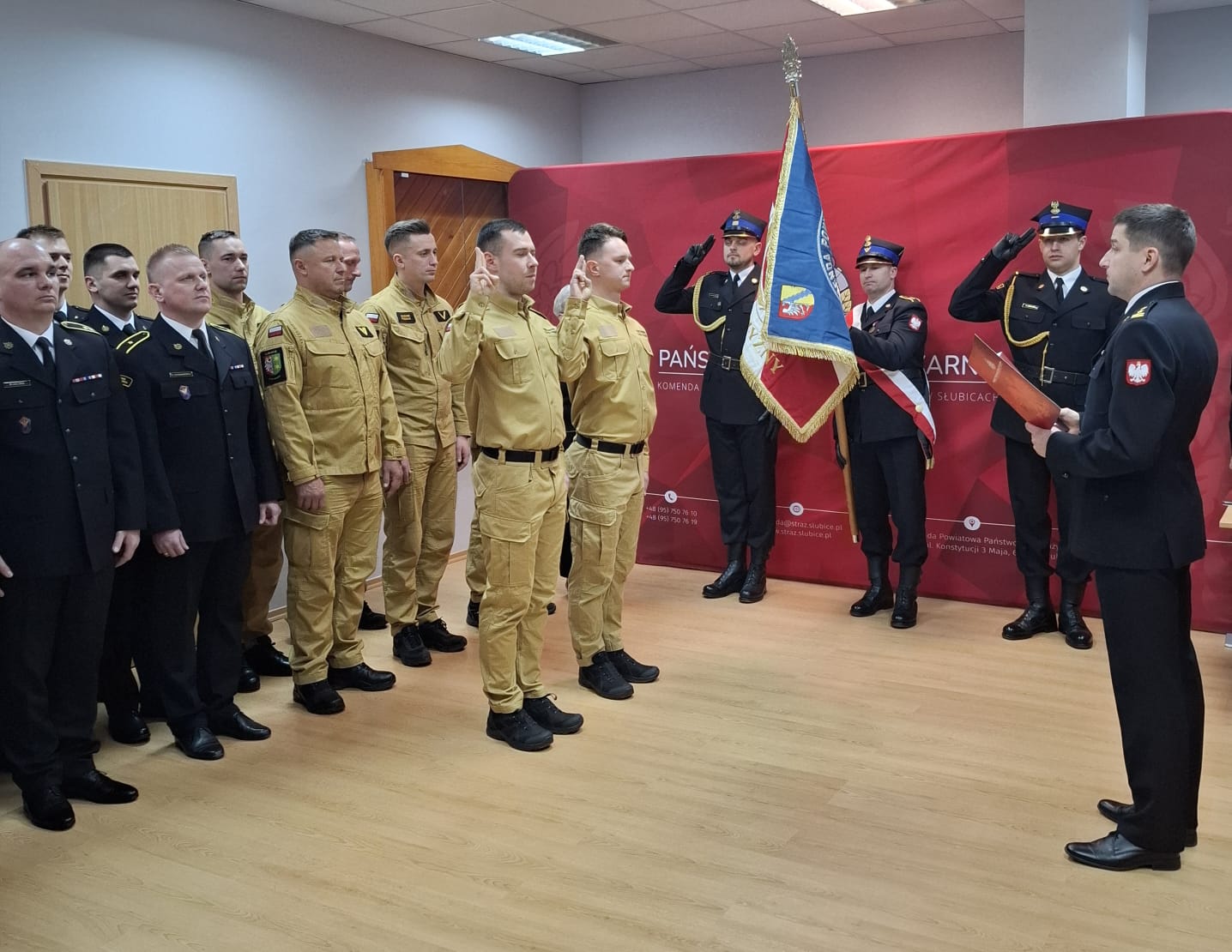 Podczas uroczystej zbiórki nastąpiło również ślubowanie, które złożyli strażacy przyjęci do służby przygotowawczej w Państwowej Straży Pożarnej. Ślubowanie Komendantowi Powiatowemu PSP w Słubicach bryg. Michałowi Borowemu złożyli: