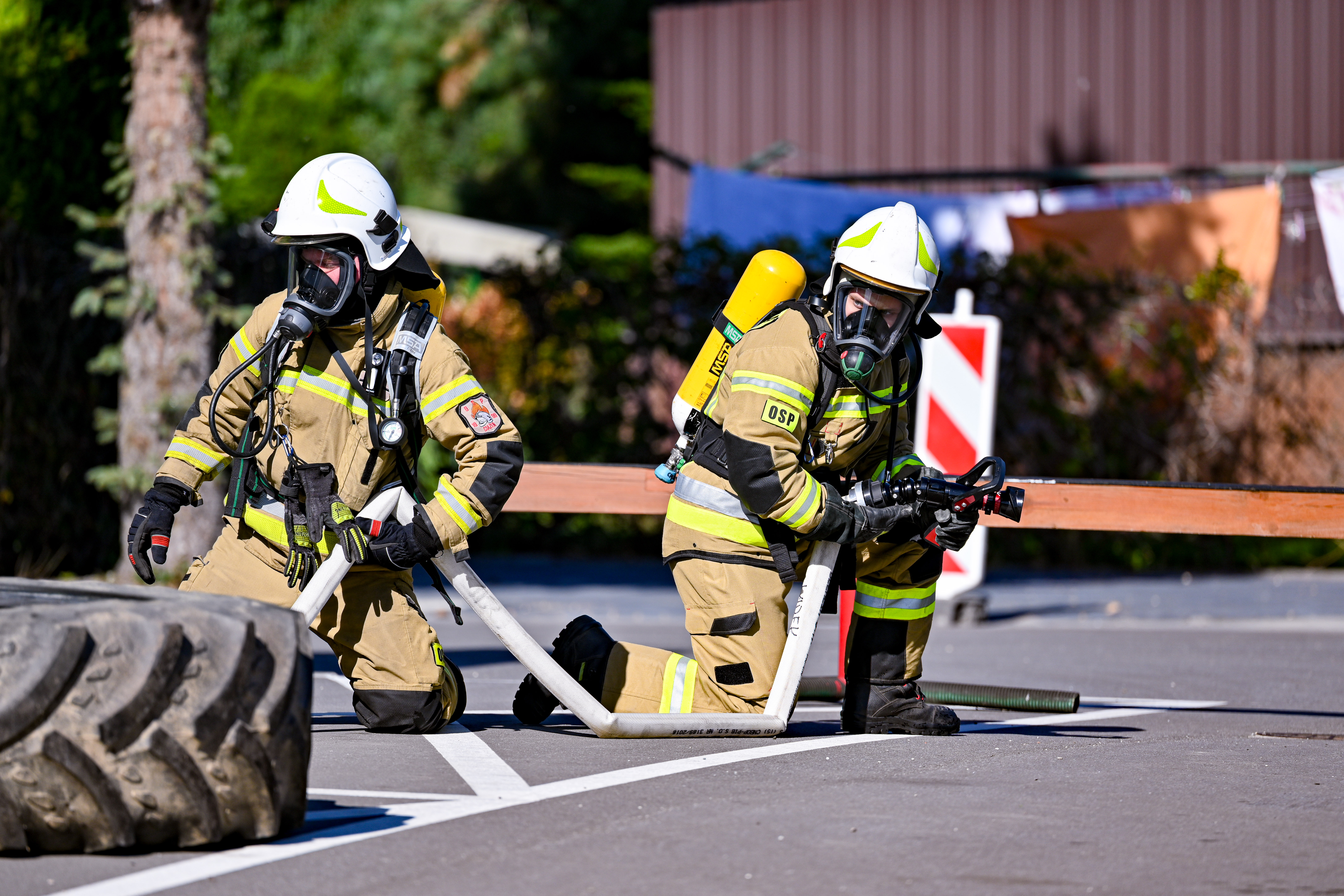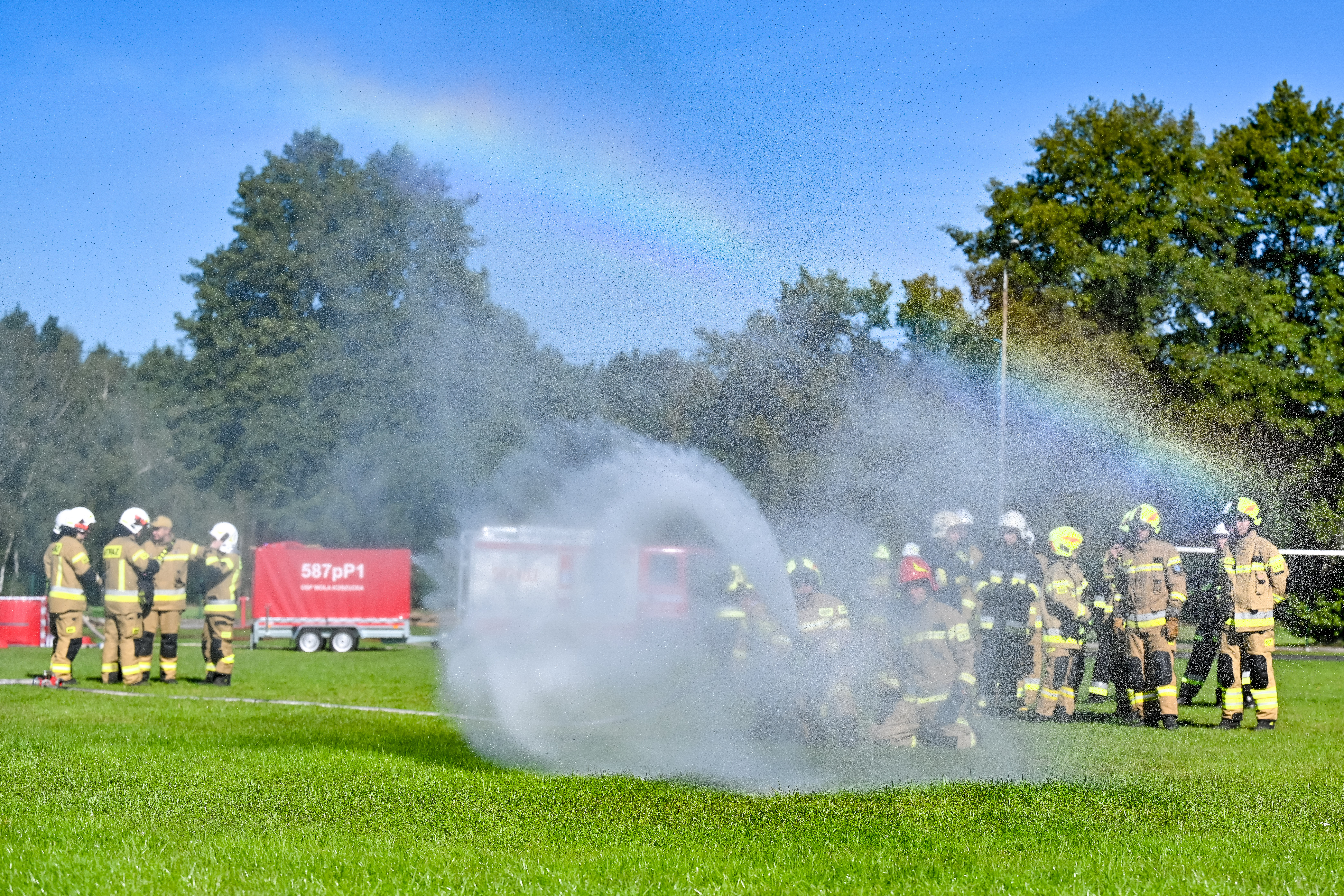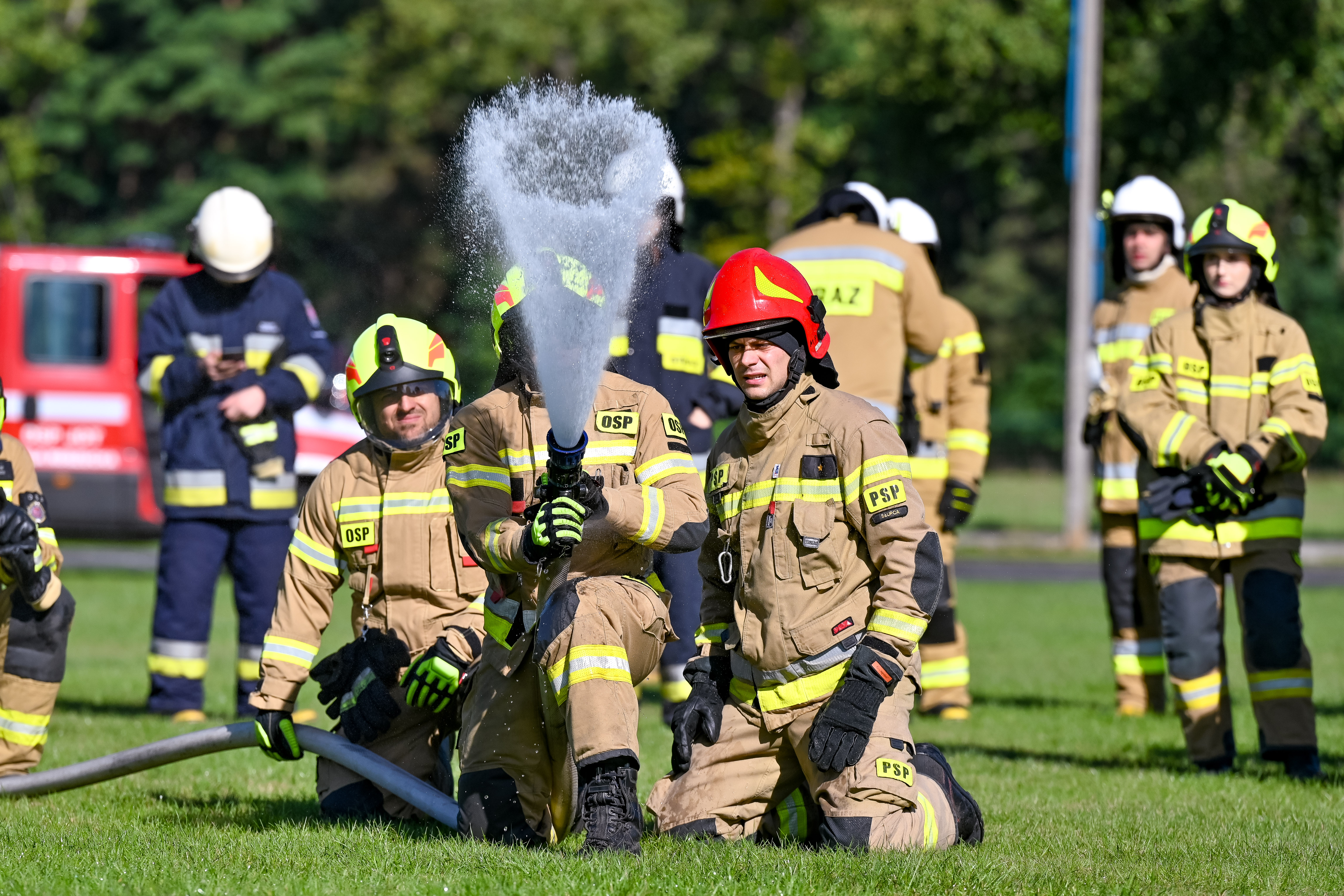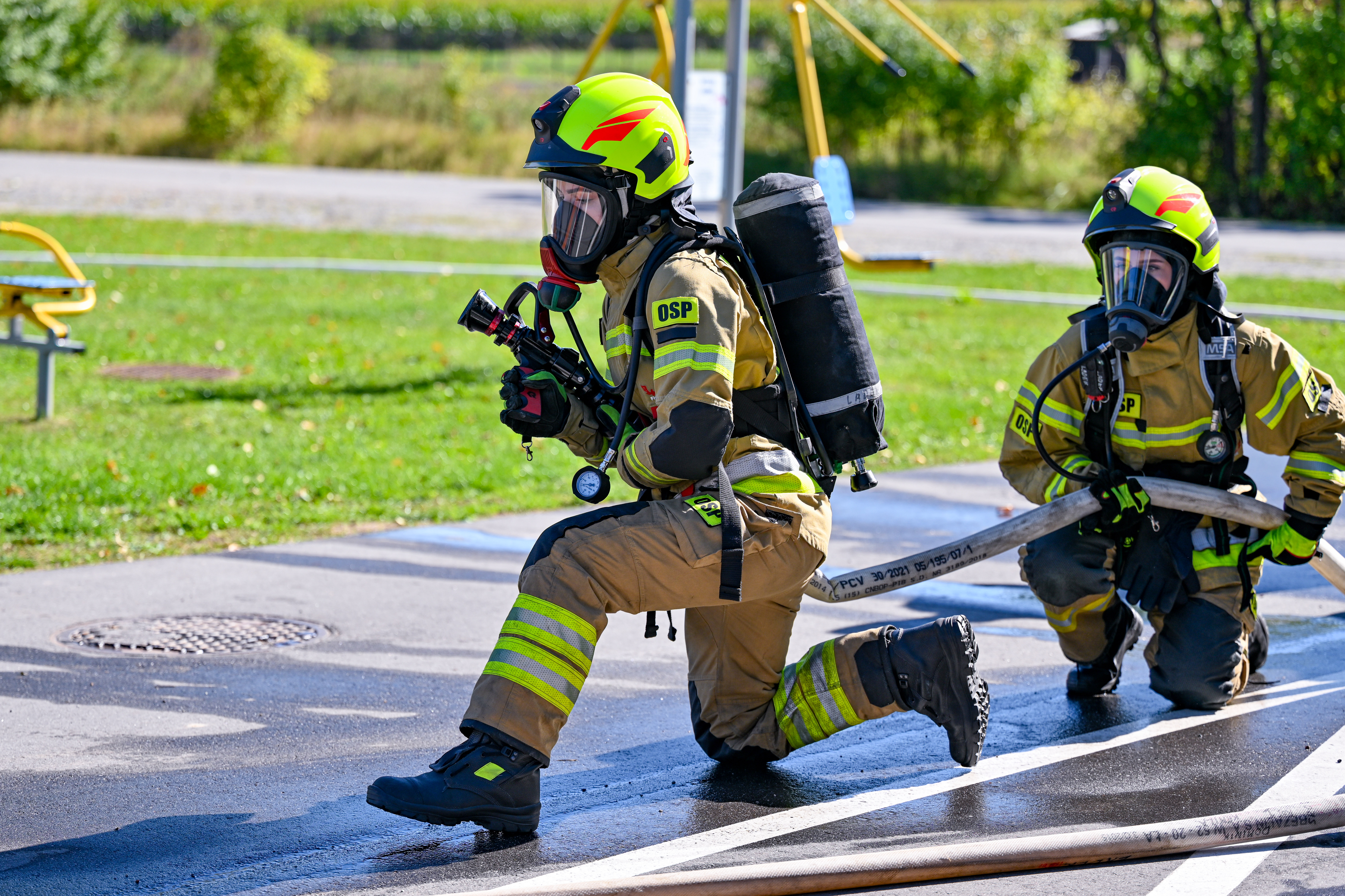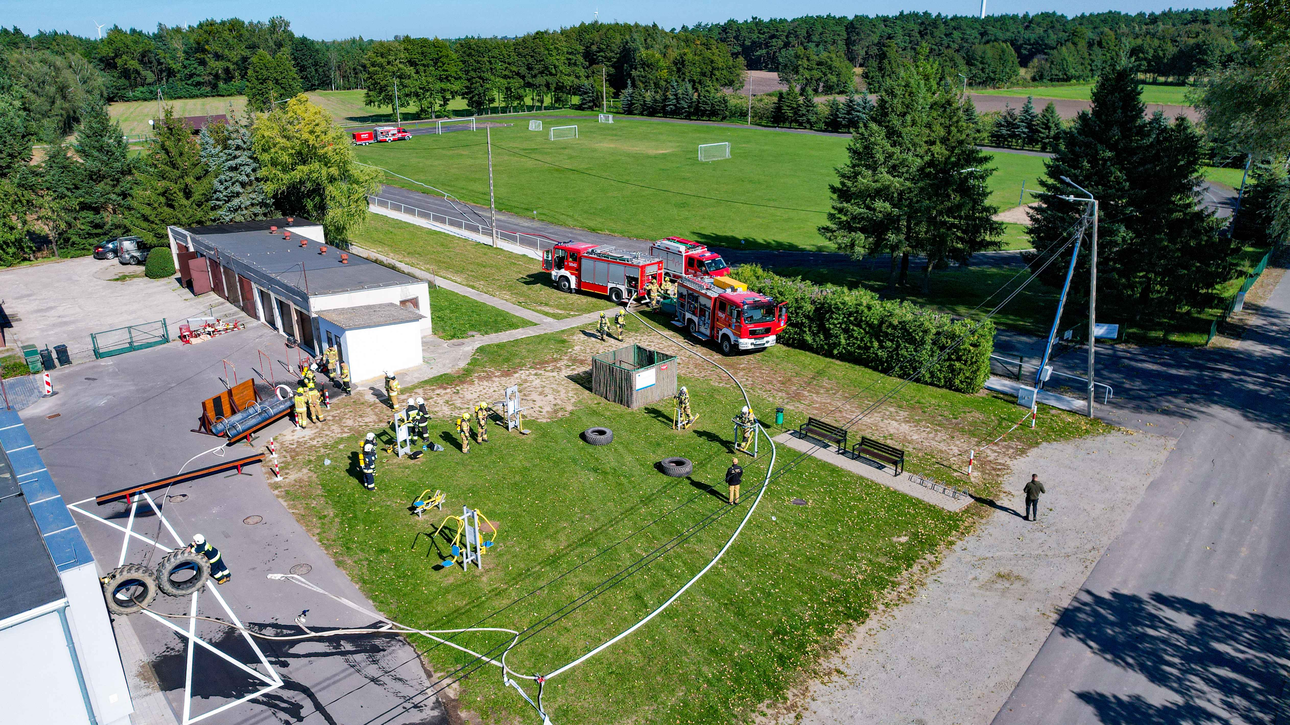Dodatkowym elementem ćwiczeń były zagadnienia związane z organizacją systemów podawania wody na duże odległości, obsługą autopomp, motopomp oraz pozostałego sprzętu silnikowego będącego na wyposażeniu jednostek OSP. Bardzo istotną część stanowiły zajęcia praktyczne dotyczące pracy w sprzęcie ochrony dróg oddechowych podczas działań gaśniczych.