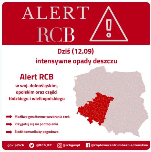 "Uwaga! Dziś (12.09) intensywne, nawalne opady deszczu. Możliwe podtopienia. Nie zbliżaj się do wezbranych rzek. Słuchaj poleceń służb" - alert RCB o tej treści został wysłany do odbiorców na terenie województwa wielkopolskiego (powiaty: gnieźnieński, gostyński, jarociński, kaliski, kępiński, kolski, koniński, krotoszyński, leszczyński, ostrowski, ostrzeszowski, pleszewski, rawicki, słupecki, średzki, śremski, turecki i wrzesiński);