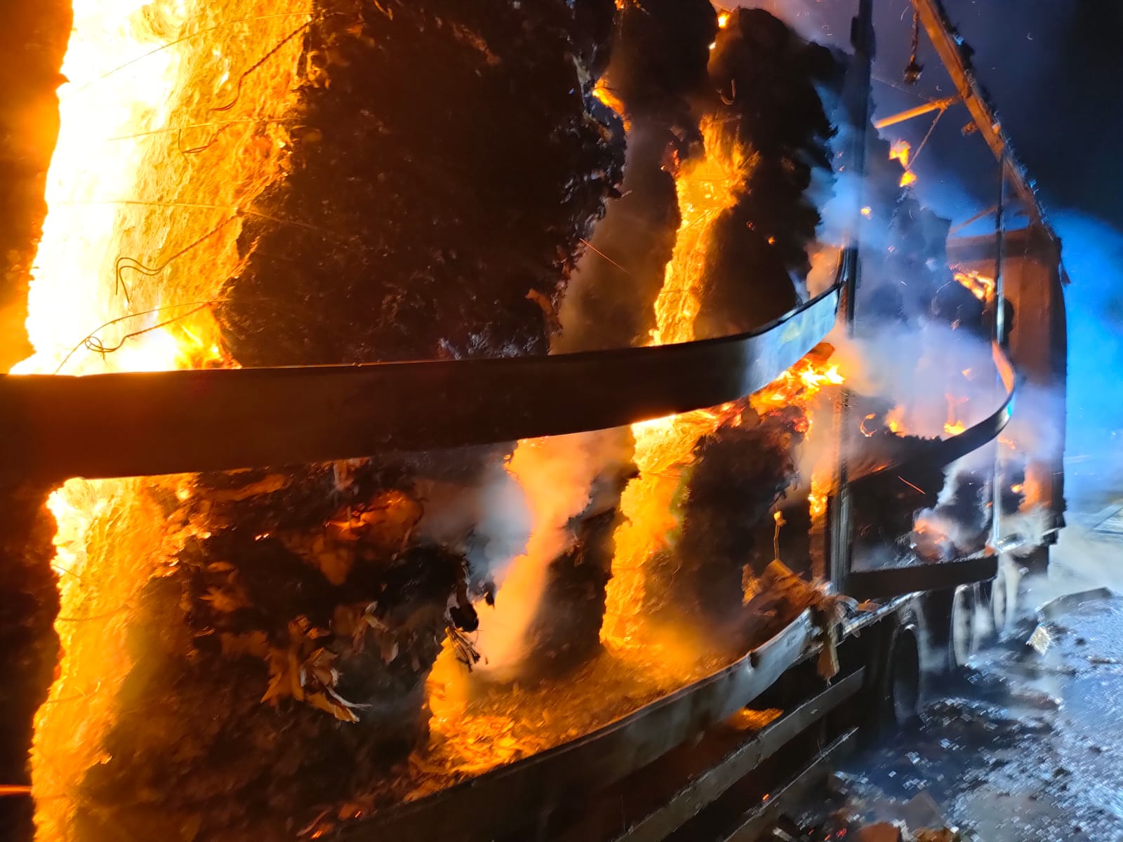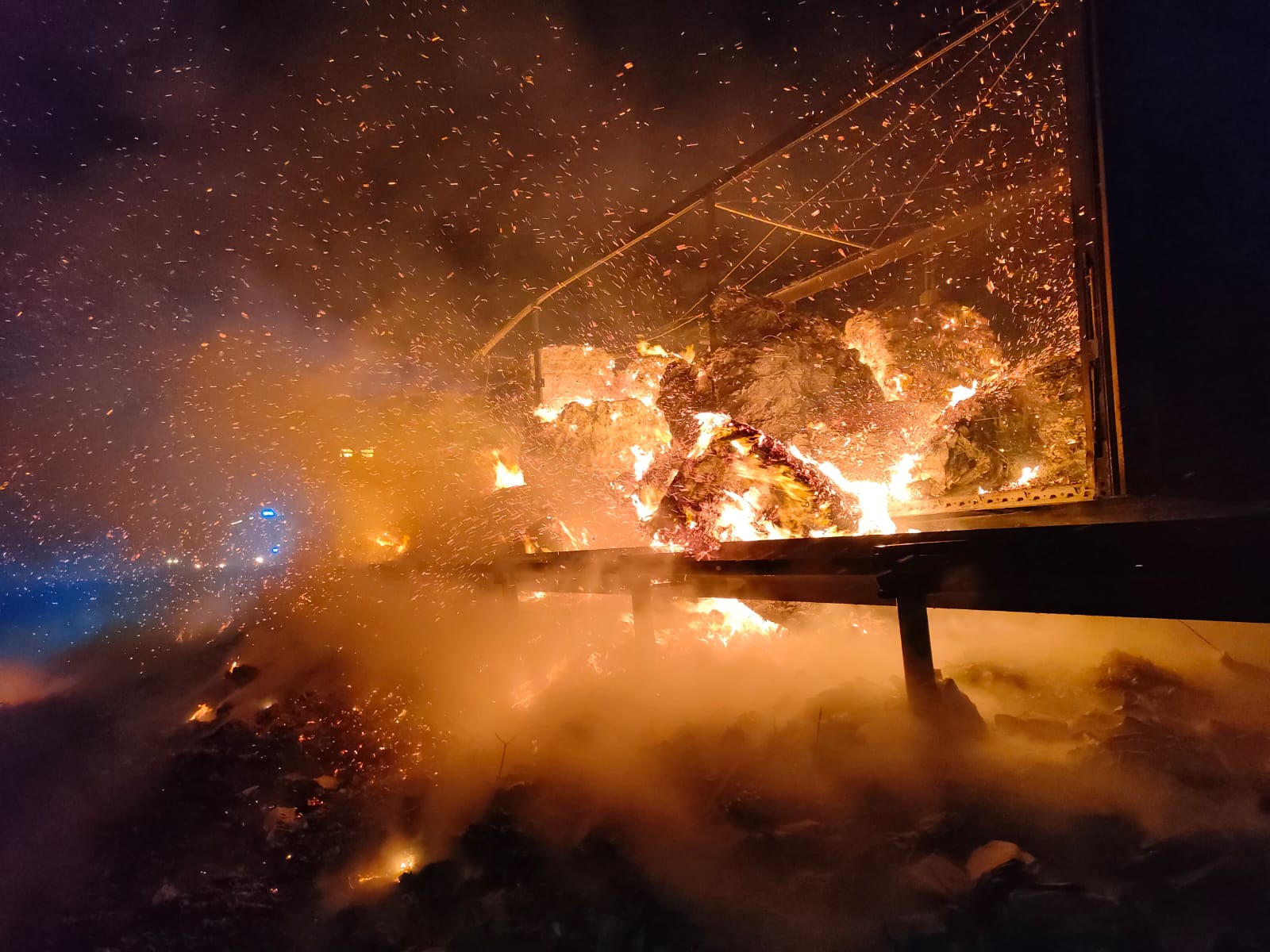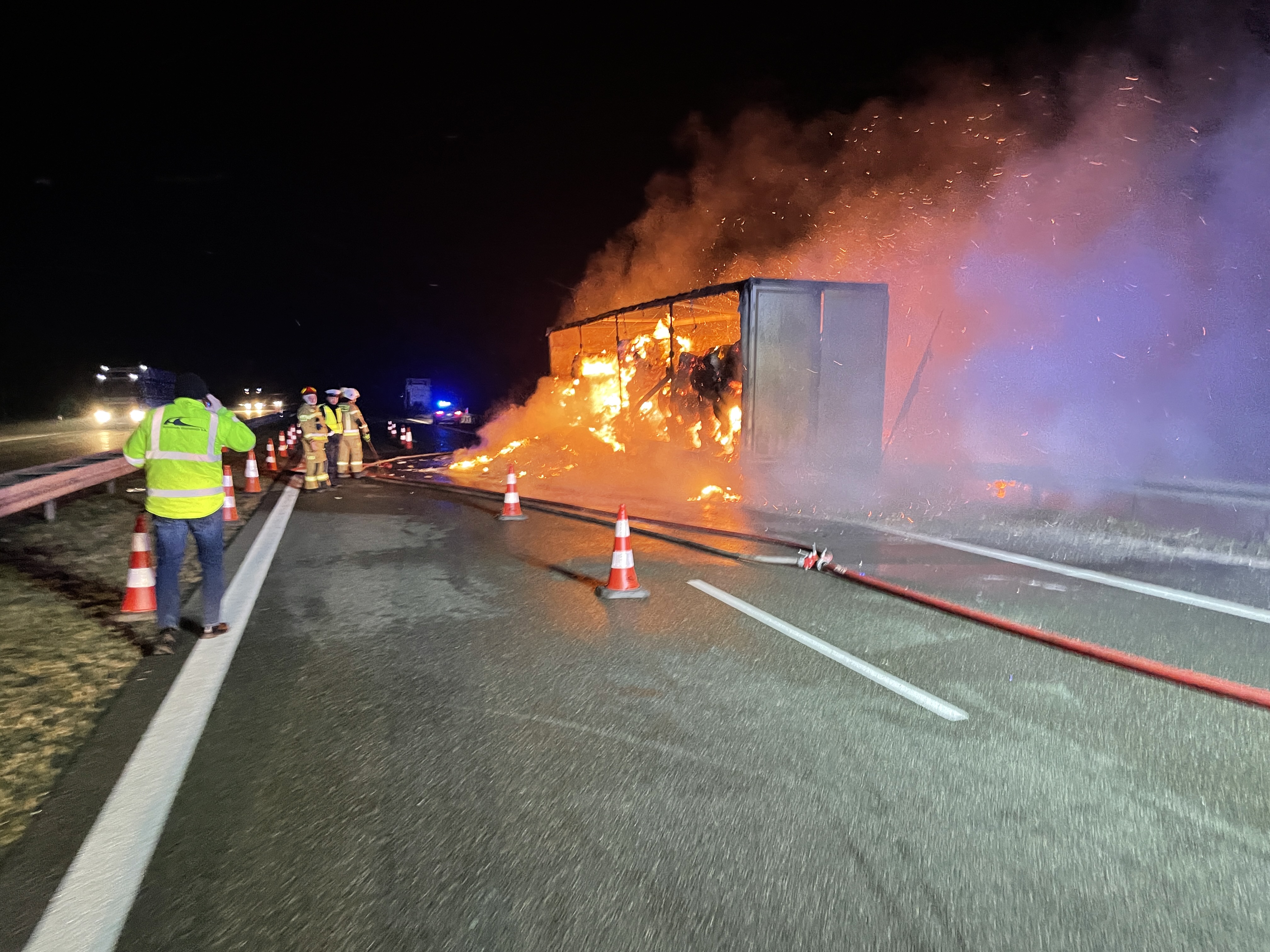 W chwili przybycia pierwszego zastępu straży pożarnej okazało się, iż pożarem objęta jest już całkowicie naczepa samochodowa, na której przewożony był sprasowany papier (makulatura) – brak osób poszkodowanych. Samochód – ciągnik siodłowy odstawiony w bezpieczne miejsce przez kierowcę. KDR natychmiast podjął decyzje o całkowitym wstrzymaniu ruchu na w/w odcinku autostrady co skutkowało z utrudnieniami w odbywaniu się ruchu - Policja oraz służby autostradowe zorganizowały objazdy.