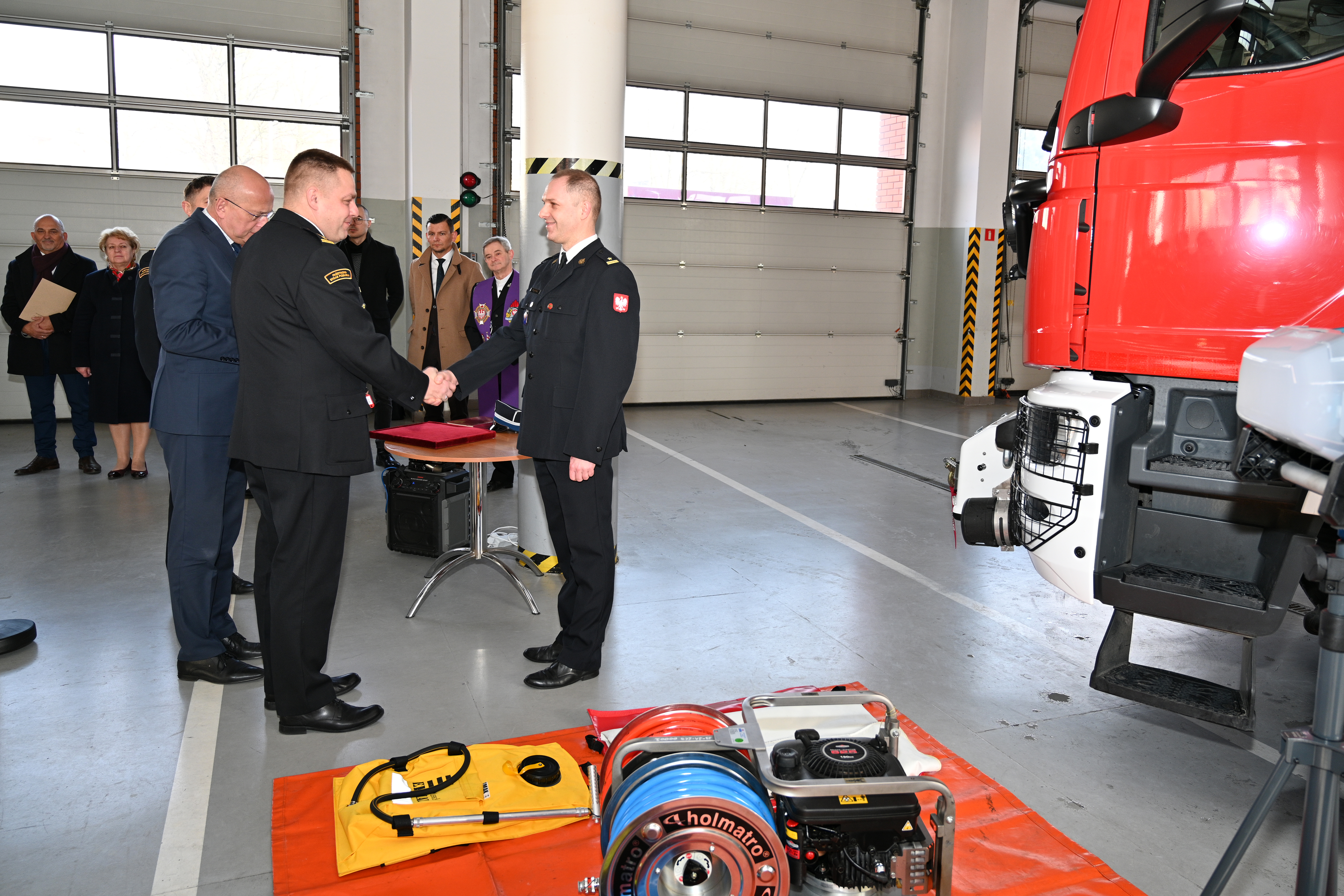 Uroczystość rozpoczęła się w wozowni tutejszej komendy, gdzie nastąpiło uroczyste poświęcenie nowego ciężkiego samochodu ratowniczo – gaśniczego oraz zakupionego sprzętu. Przekazania kluczyków dokonał st. bryg. Jarosław Zamelczyk - Zastępca Wielkopolskiego Komendanta Wojewódzkiego Państwowej Straży Pożarnej w Poznaniu w asyście bryg. Zbigniewa Rzemyszkiewcza Komendanta Powiatowego PSP w Słupcy i Starosty Słupeckiego pana Jacka Bartkowiaka.