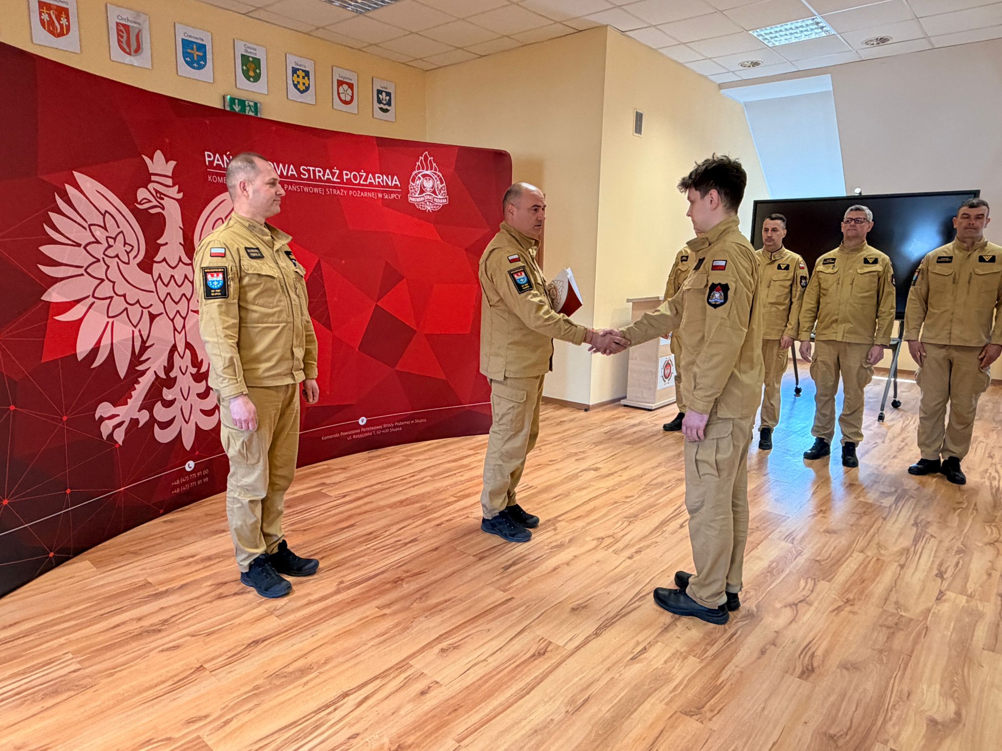 10 kwietnia 2026 roku na uroczystej zbiórce Komendant Powiatowy PSP w Słupcy mł. bryg. Sławomir Gołębiak w obecności strażaków i pracowników cywilnych tut. komendy wręczył decyzję o przyjęciu do służby w Państwowej Straży Pożarnej str. Miłoszowi Kaszubie. To nie tylko zawód, ale przede wszystkim misja i zobowiązanie wobec mieszkańców powiatu słupeckiego.
