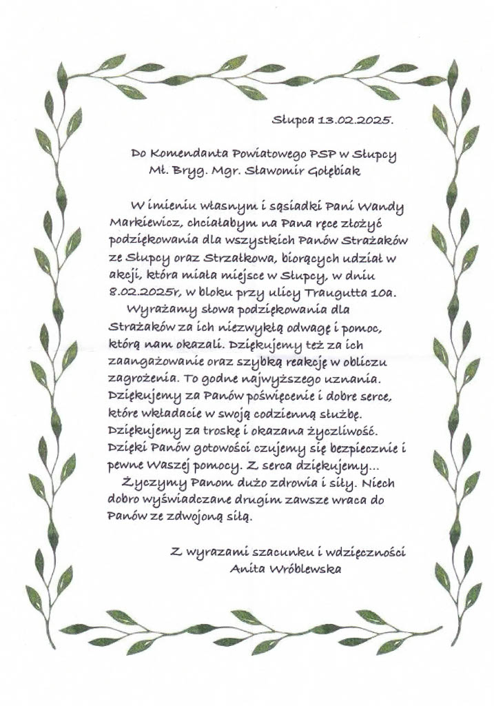 20 lutego do Komendanta Powiatowego Państwowej Straży Pożarnej w Słupcy mł. bryg Sławomira Gołębiaka wpłyneły podziękawania od mieszkańców bloku dotyczace działań, które zostały podjęte przez strażaków 9 lutego w Słupcy na ul. Traugutta.