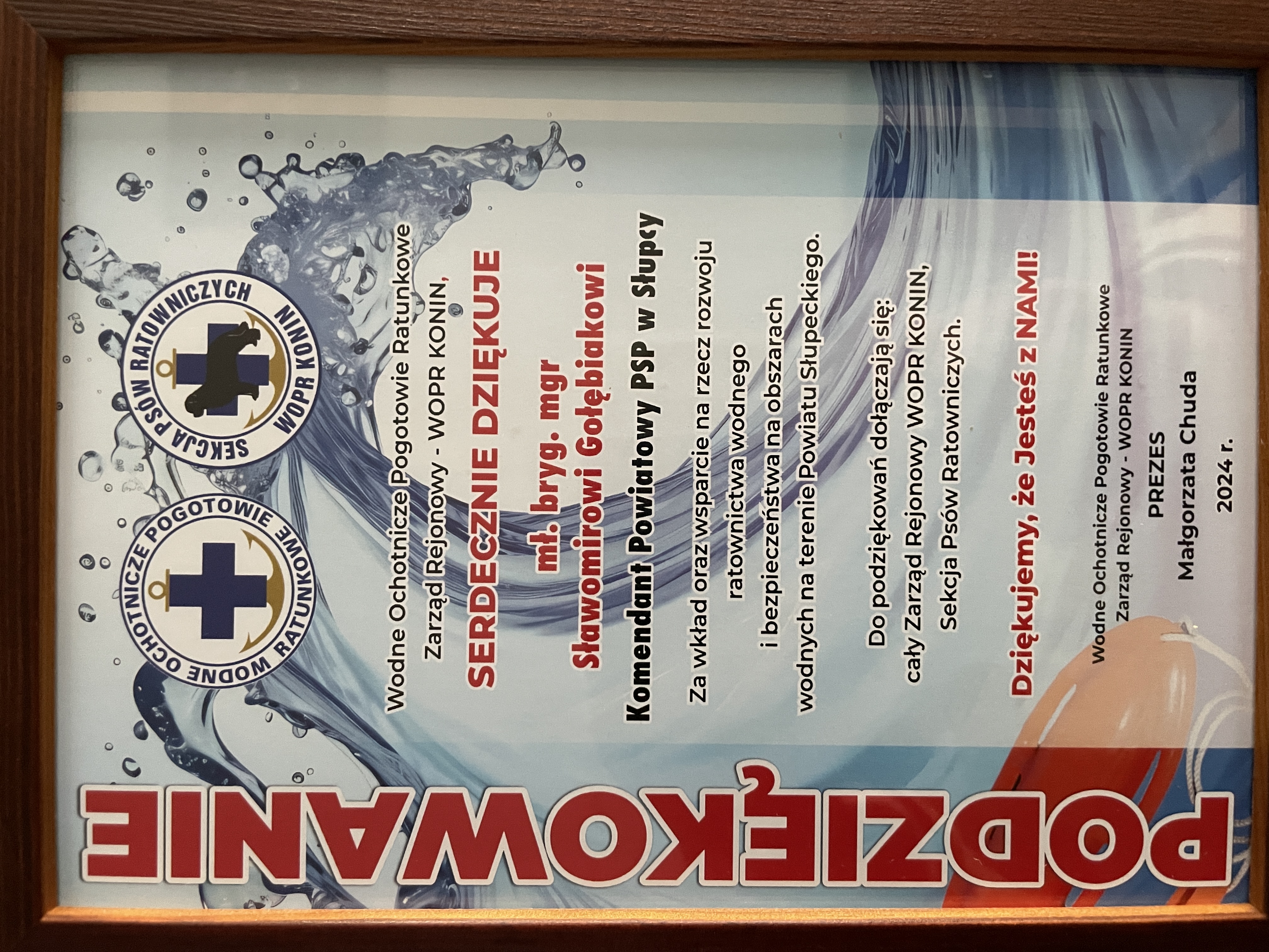Na ręce pana Komendanta Powiatowego Państwowej Straży Pożarnej w Słupcy mł. bryg. Sławomira Gołębiaka wpłyneło podziękowanie od Zarządu Rejonowego WOPR w Koninie za wkład oraz wsparcie ratownictwa wodnego i bezpieczeństwa na obszarach wodnych terenu powiatu słupeckiego.