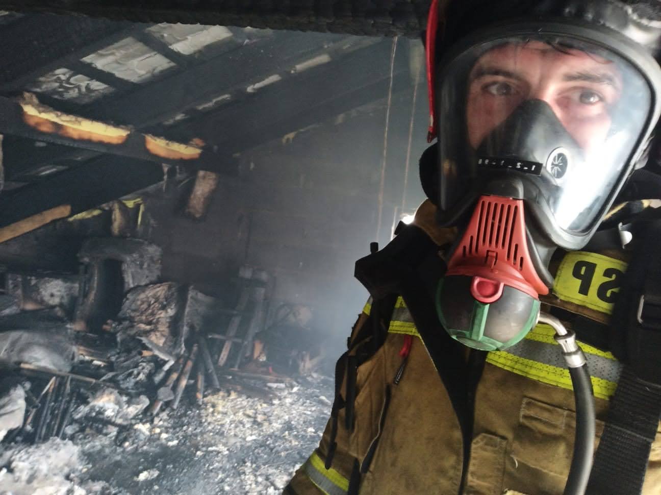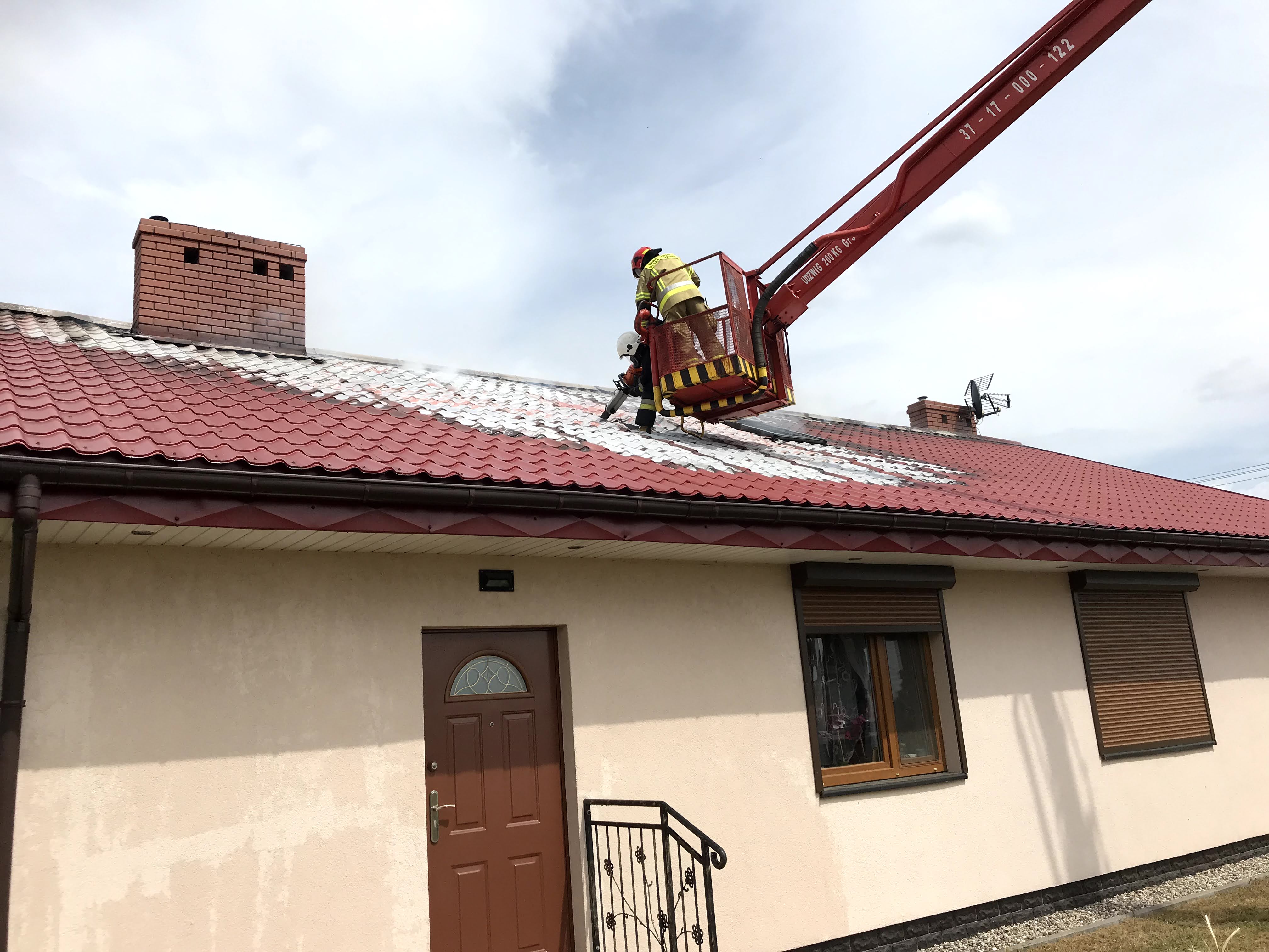 Strażacy w sprzęcie ochrony dróg oddechowych dotarli do źródła pożaru na poddaszu budynku mieszkalnego gasząc pożar.