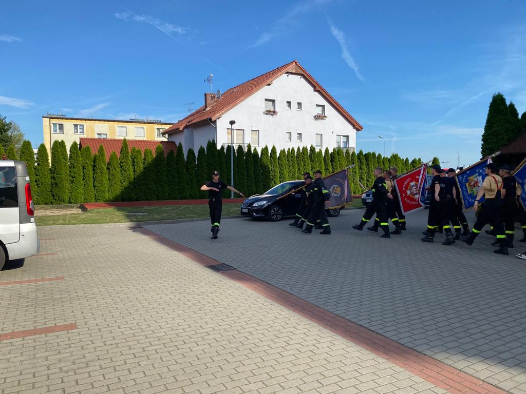 Funkcjonariusze - asp. Maciej Patrzykąt oraz mł. kpt. Kamil Kujawa przeprowadzili również trening praktyczny podczas którego druhowie ćwiczyli podstawowe chwyty sztandaru, a także postawy, wystąpienia, marsz, zwroty, zatrzymanie i zmiany szyku pocztu sztandarowego podczas uroczystości. Omówiono i przećwiczono zachowanie pocztu sztandarowego w kościele podczas uroczystej Mszy Świętej.