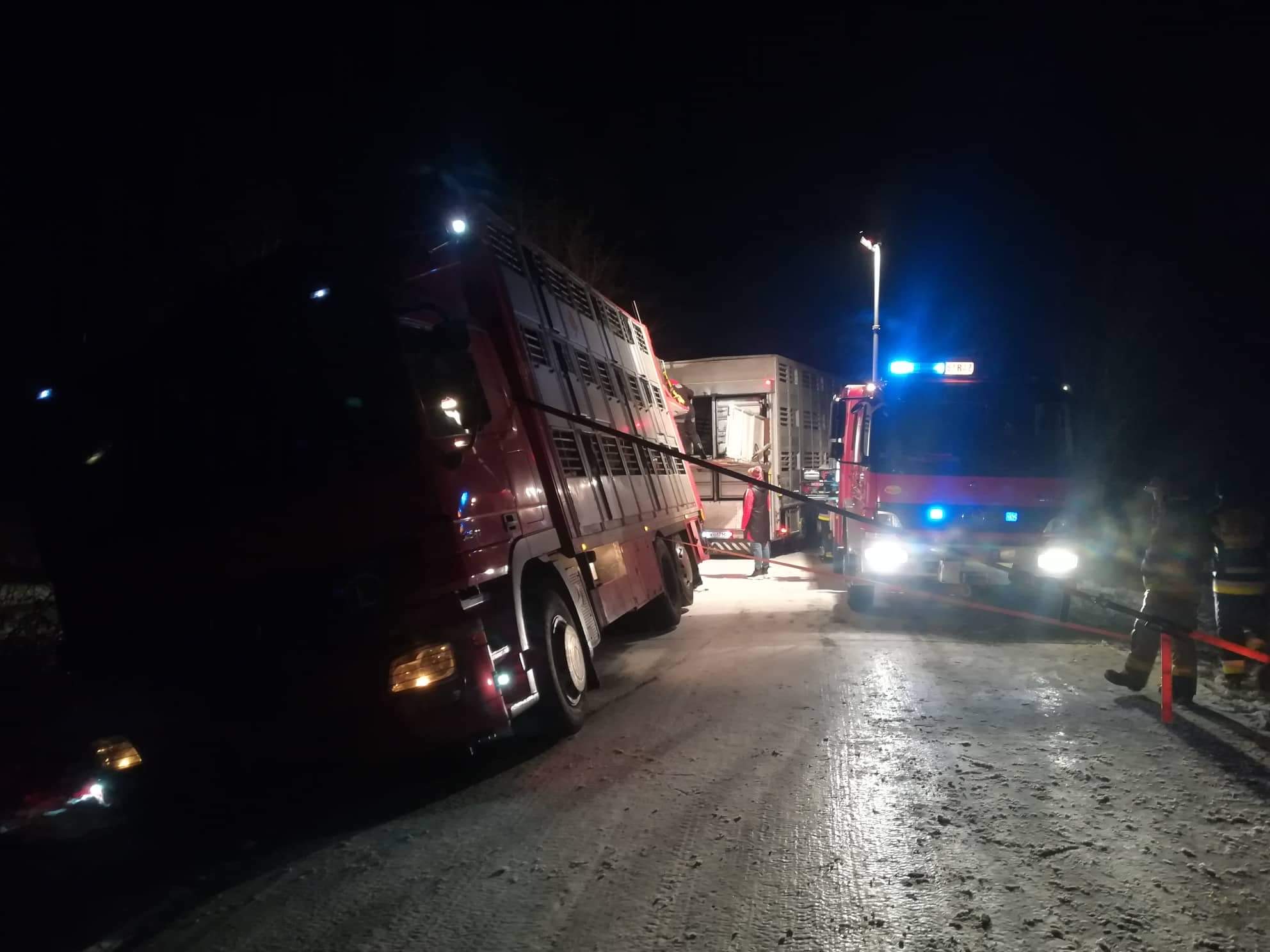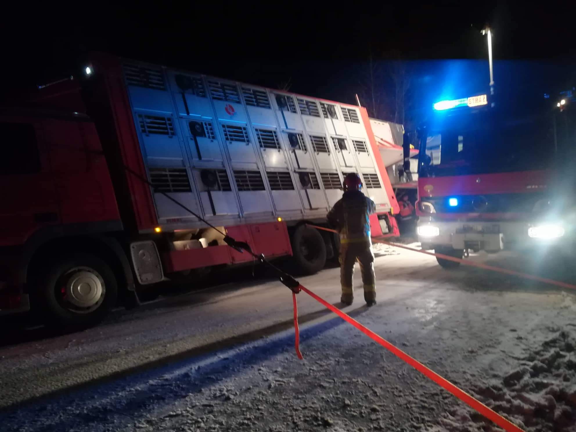 Strażacy przy użyciu pasów transportowych zabezpieczyli samochód. Następnie do sprowadzonych samochodów przetransportowano zwierzęta i wyciagnieto przechyloną ciężarówkę.