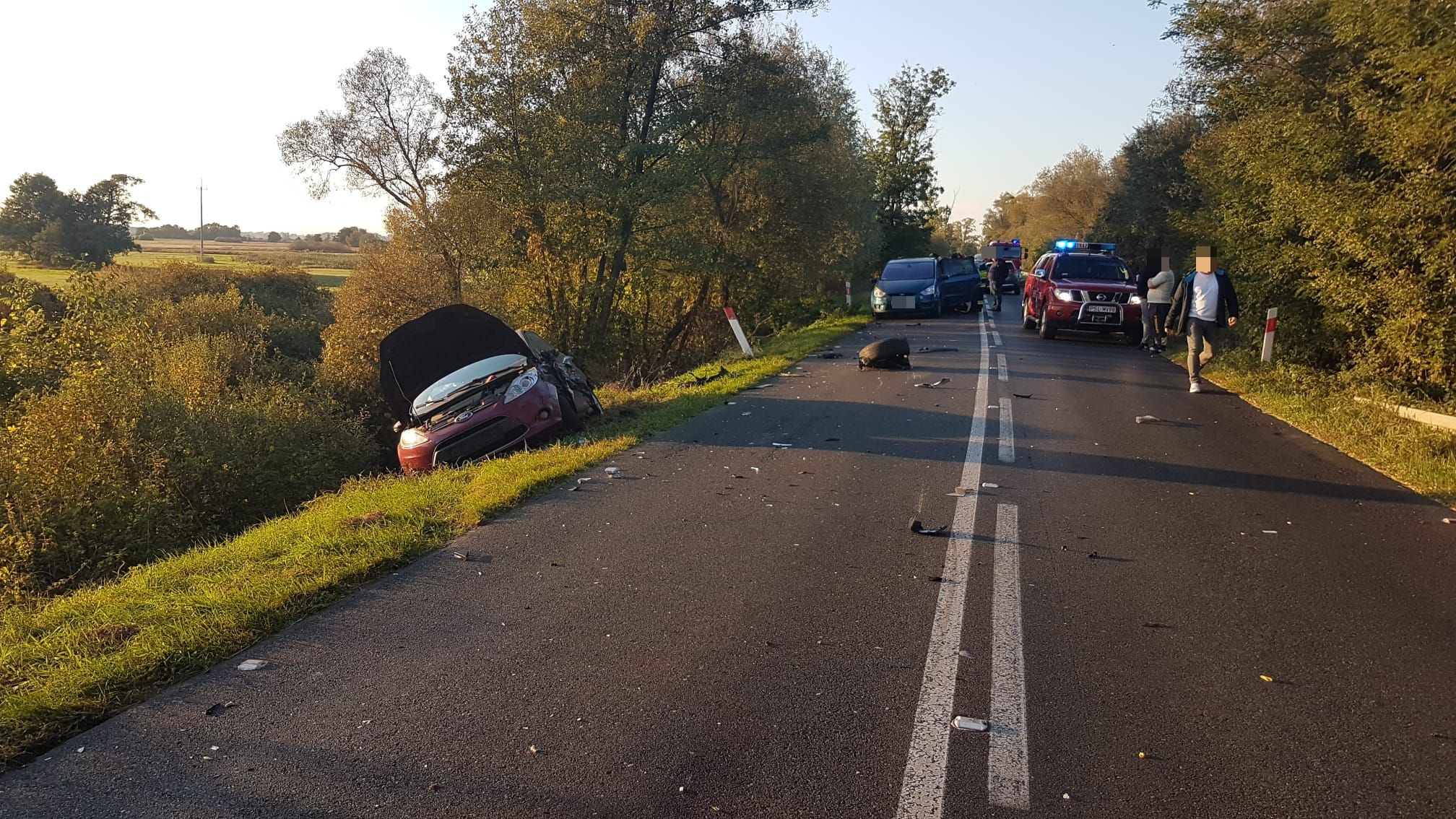 W chwili przybycia zastępów SP na miejsce zdarzenia zastano rozbite trzy samochody osobowe, z których dwa znajdowały się na drodze jeden na poboczu drogi – droga w dwóch kierunkach nieprzejezdna. W zdarzeniu brało udział pięć osób w tym jedno dziecko.