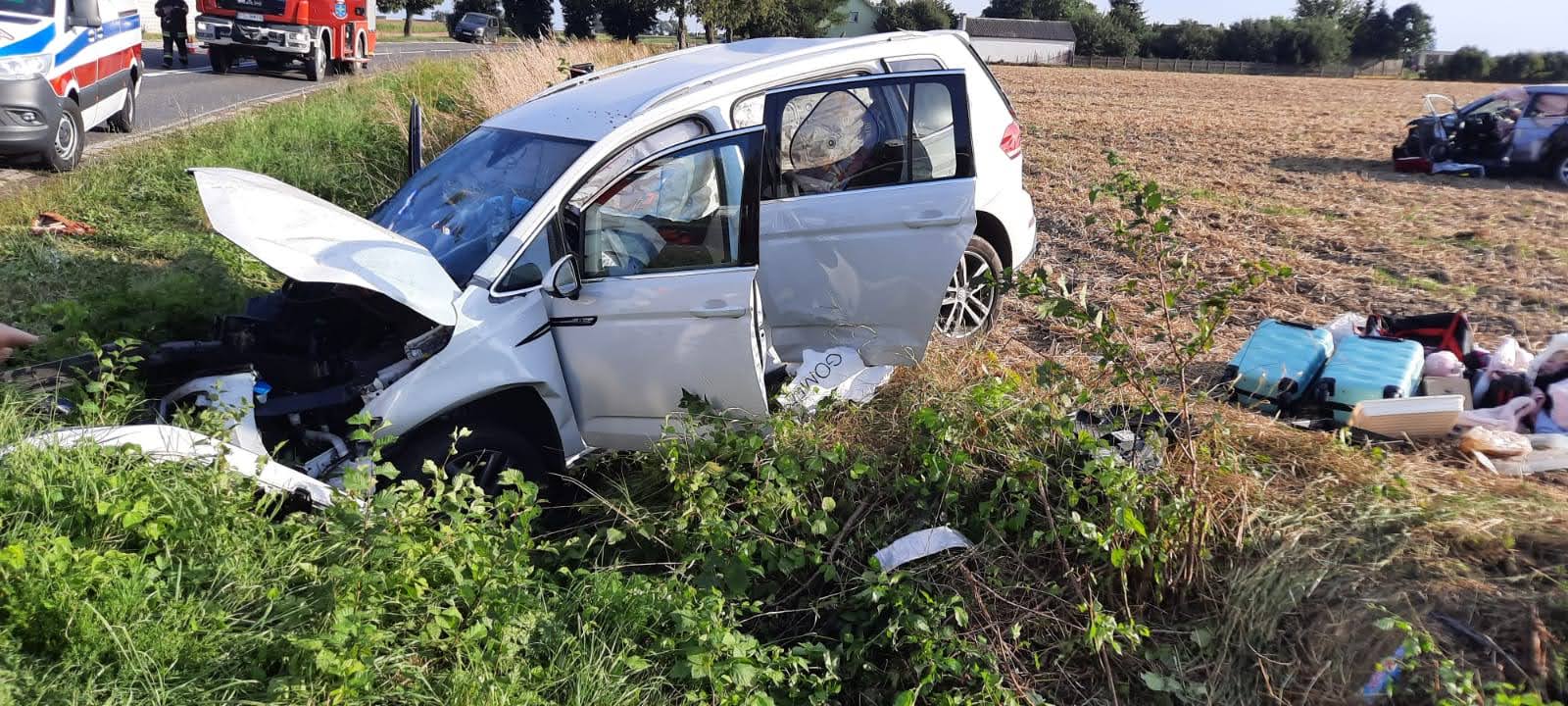 W chwili przybycia zastępów SP na miejsce zdarzenia zastano rozbite dwa samochody znajdujące się poza jezdnią na polu uprawnym. W zdarzeniu brało udział 9 osób w tym 6 dzieci. Strażacy, aby dotrzeć do 3 osób uwięzionych w pojeździe i udzielić im kwalifikowanej pierwszej pomocy użyli sprzętu hydraulicznego po czym przekazano poszkodowanych zespołom ZRM.