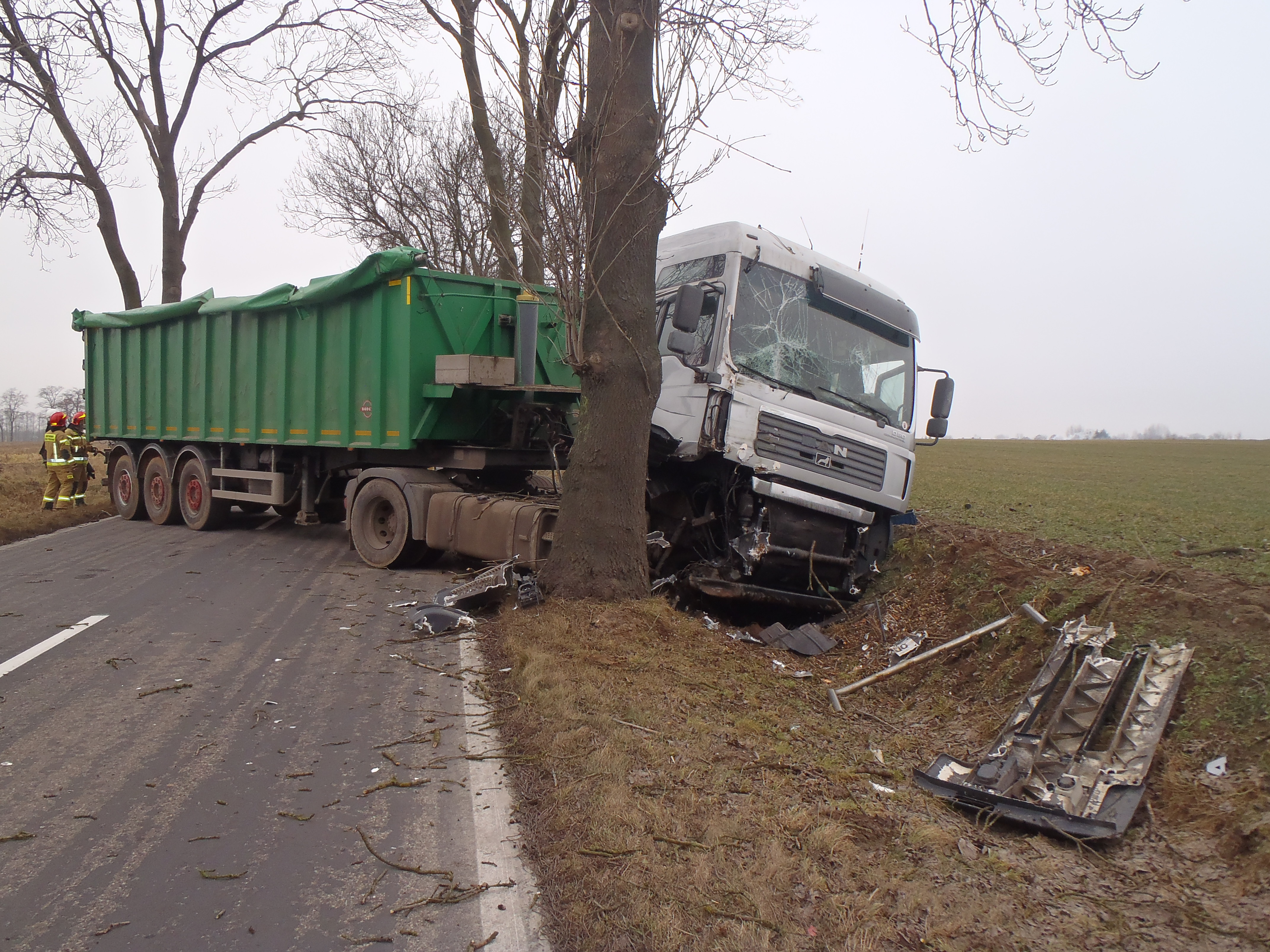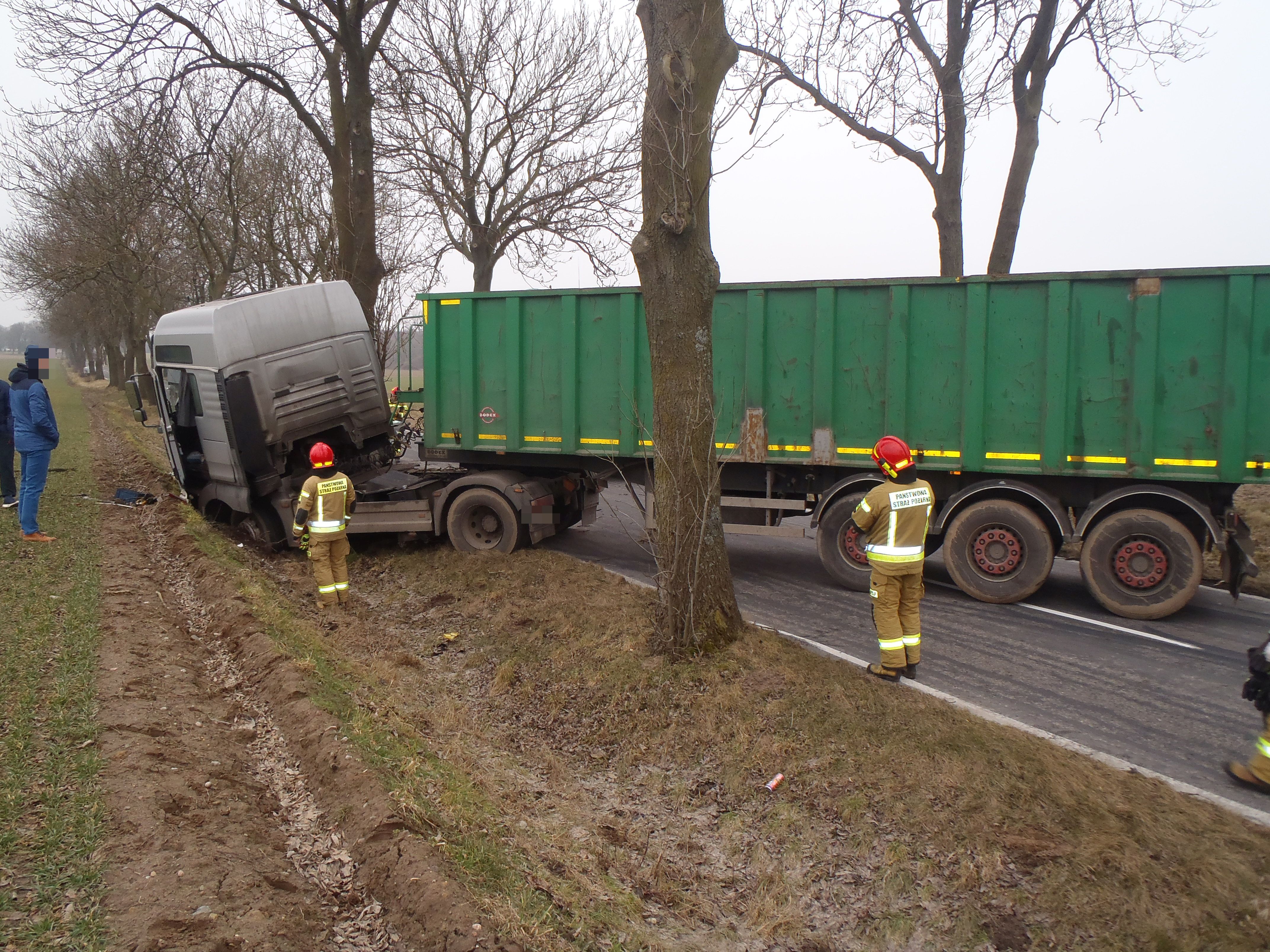 Po dojeździe SP na miejsce zdarzenia zastano ciągnik siodłowy z naczepą, który uderzył w drzewo, droga całkowicie zablokowana, kierowca znajduje się poza pojazdem. Naczepa była pusta. Kierowca potrzebuje pomocy ZRM uskarża się na ból głowy. SIS wystarczające.
