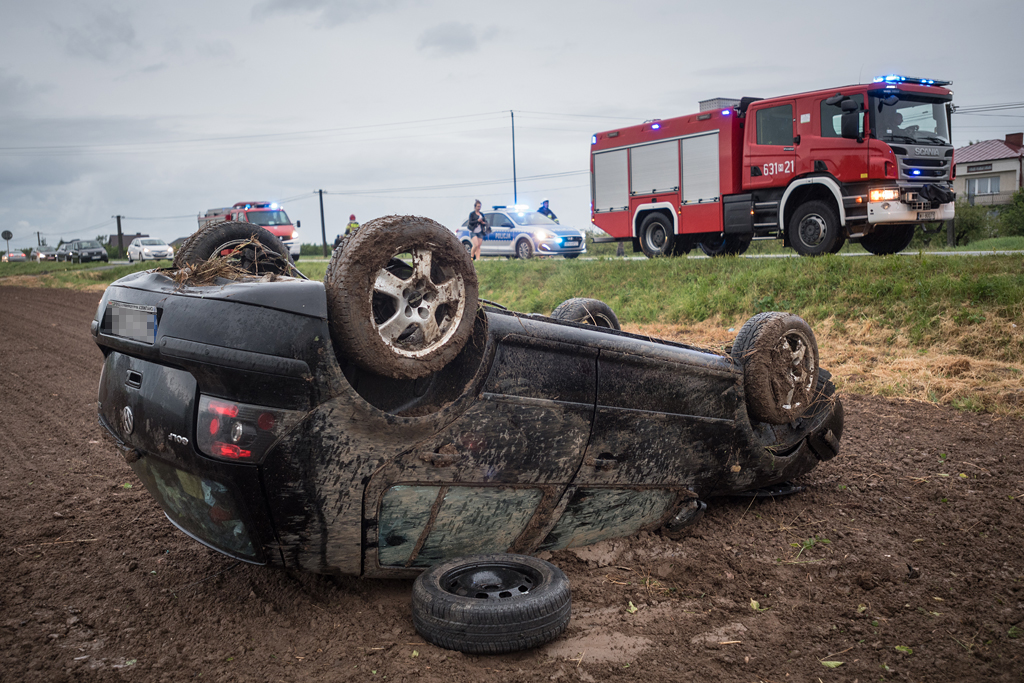 Po dojeździe stwierdzono, że samochód osobowy marki Volkswagen Golf wypadł z drogi i dachował w polu. Pojazdem podróżowała jedna osoba, która wysiadła z auta o własnych siłach przed przybyciem służb ratowniczych. Po przebadaniu przez zespół ratownictwa medycznego, osoba ta pozostała na miejscu zdarzenia.