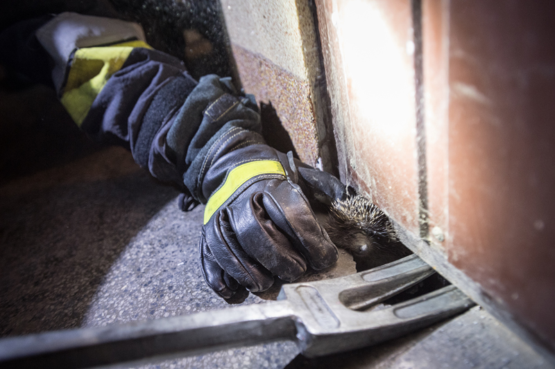 Ratownicy przy użyciu sprzętu burzącego powiększyli otwór, w którym unieruchomiony był jeż, tym samym oswobadzając go ze śmiertelnego potrzasku.