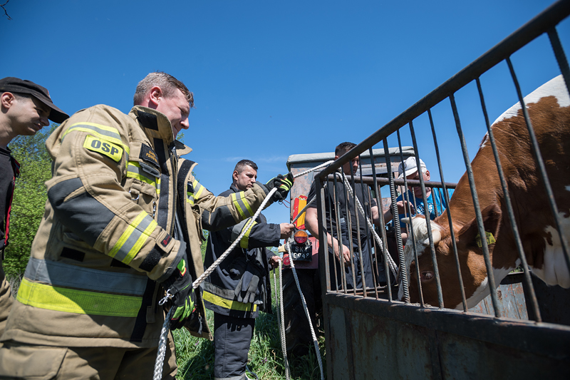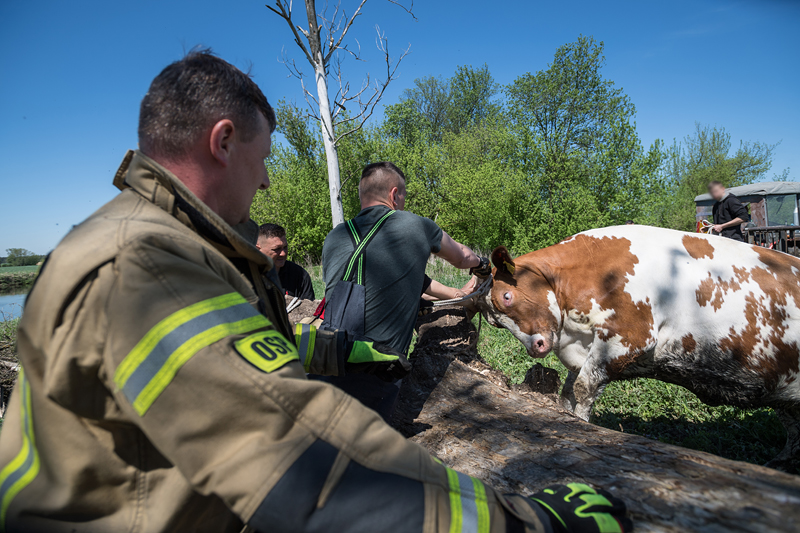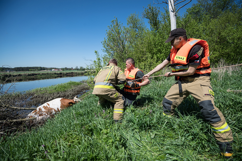 Po dojeździe na miejsce zdarzenia potwierdzono informacje uzyskane od osoby zgłaszającej. Wykorzystując chwilę, gdy jałówka odpoczywała na brzegu rzeki, strażacy z pomocą liny wydobyli zwierzę, a następnie przekazali właścicielowi.