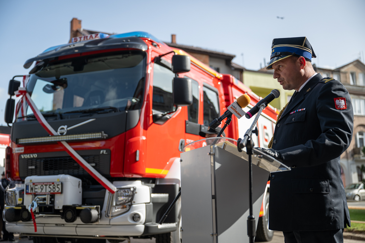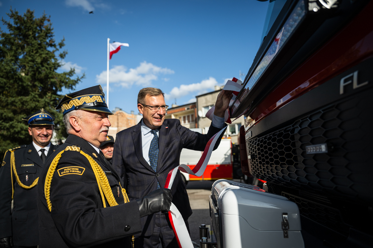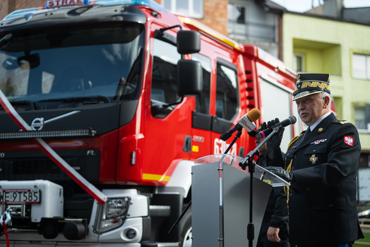 Uroczystego wręczenia aktu przekazania i kluczyków do nowego pojazdu dokonali: Pan Maciej Małecki - Sekretarz Stanu w Ministerstwie Aktywów Państwowych, Pani Jolanta Gonta - starosta sochaczewski oraz Mazowiecki Komendant Wojewódzki PSP nadbryg. Jarosław Piotrowski.