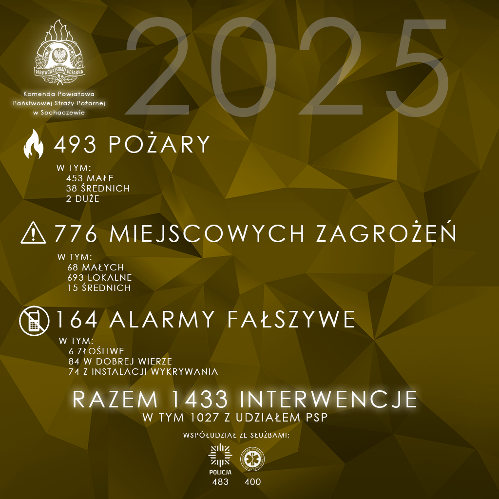 W sumie przeprowadzono 1433 interwencji, co w porównaniu z liczbą 1426 w 2024 roku daje minimalny wzrost o 0,5%.