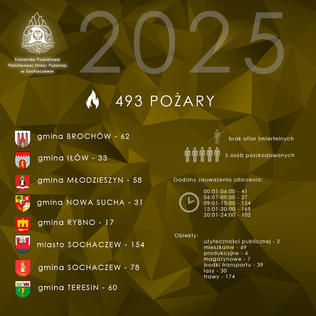 Przez cały 2025 rok pożarów w obiektach mieszkalnych odnotowano 69 (z czego 34 przypadki pożarów sadzy w kominie), w instytucjach użyteczności publicznej 2, w obiektach produkcyjno-magazynowych 13, środków transportu 39, traw 174, w lasach 30 (z czego 4 o powierzchni powyżej 1 ha). Według szacunków w akcjach gaśniczych strażacy zużyli około 2159 metrów sześciennych wody