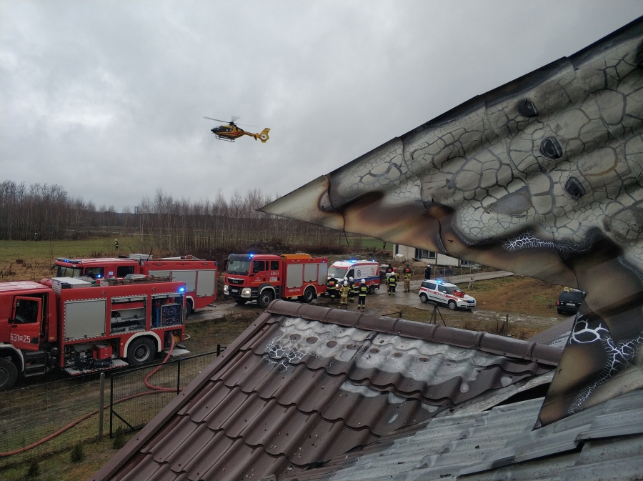 Działania straży pożarnej polegały na zabezpieczeniu miejsca zdarzenia, podaniu trzech prądów gaśniczych wody w natarciu - jednego z zewnątrz i dwóch do środka oraz udzieleniu poszkodowanemu kwalifikowanej pierwszej pomocy. Mężczyzna został przekazany zespołowi ratownictwa medycznego, który stwierdził konieczność transportu do szpitala drogą lotniczą. Strażacy zabezpieczyli miejsce lądowania i startu helikoptera Lotniczego Pogotowia Ratunkowego.