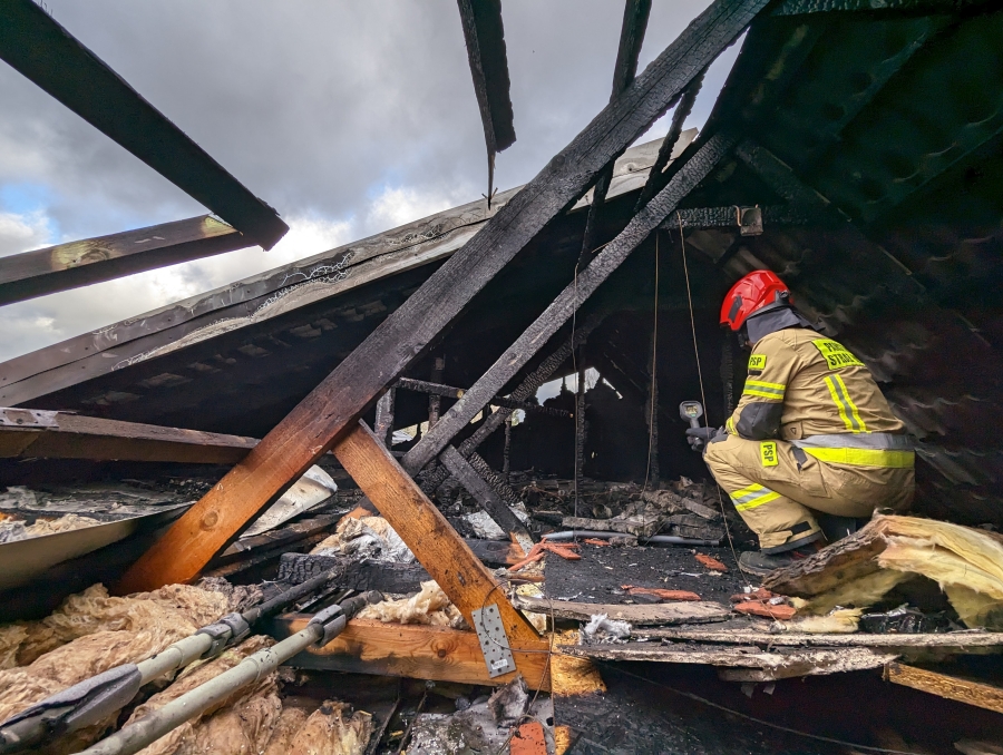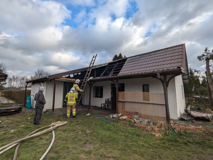 Przybyli na miejsce strażacy zastali pożar poddasza oraz jednej ze ścian parterowego budynku mieszkalnego konstrukcji drewnianej. W chwili powstania zdarzenia w domu przebywała jedna osoba, która po zauważeniu oznak pożaru wyszła z budynku.
