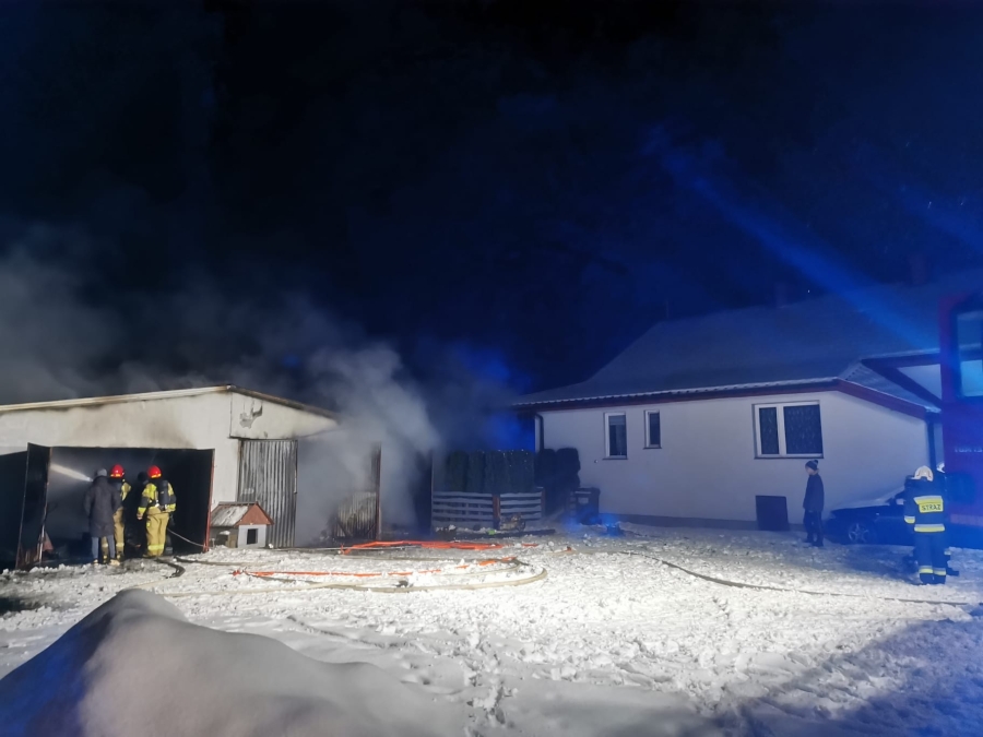 Przybyli na miejsce strażacy zastali pożar murowanego budynku krytego blachą, w którym znajdowały się m. in. dwa ciągniki rolnicze, paliwo i sprzęt warsztatowy.