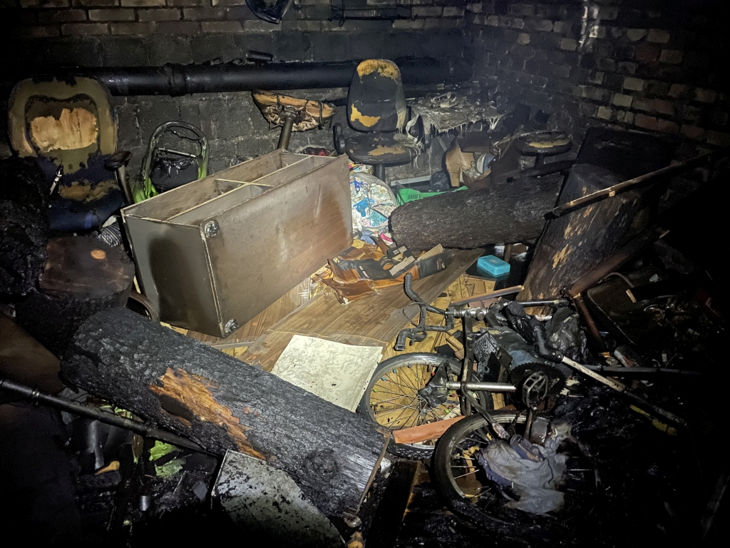 Po dojeździe na miejsce i przeprowadzeniu rozpoznania stwierdzono pożar w fazie rozwiniętej jednej z komórek lokatorskich w piwnicy trzykondygnacyjnego budynku mieszkalnego. W chwili przybycia zastępów część mieszkańców zdążyła opuścić swoje mieszkania, inni zaś pozostawali w swoich mieszkaniach przebywając przy otwartych oknach.