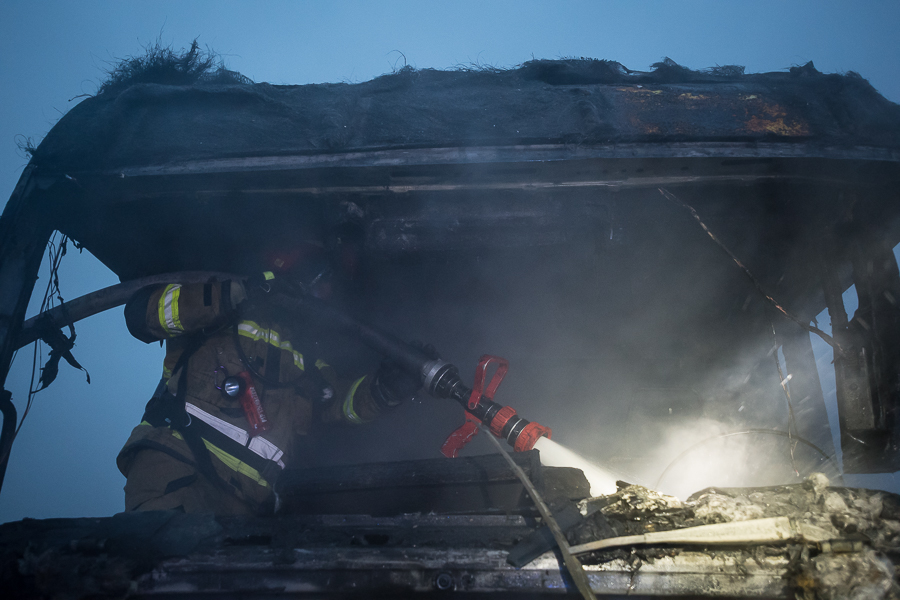 Działania straży pożarnej polegały na zabezpieczeniu miejsca zdarzenia oraz podaniu dwóch prądów wody w natarciu. Po ugaszeniu pożaru spaloną kabinę sprawdzono kamerą termowizyjną nie stwierdzając miejsc o podwyższonej temperaturze.