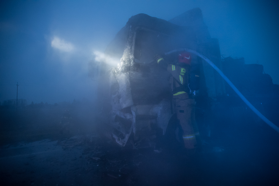 Po przybyciu na miejsce stwierdzono, że pożarem w całości objęta jest kabina ciągnika siodłowego MAN sprzężonego z naczepą przewożącą stalowe druty. Kierowca po zauważeniu pożaru opuścił pojazd i nie wymagał pomocy medycznej.