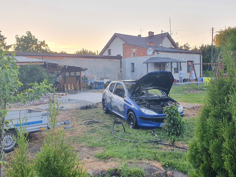 Po dojeździe stwierdzono, że pożar objął samochód osobowy marki Peugeot oraz wiatę garażową. Właściciel posesji z osobami postronnymi wypchnął palący się pojazd do ogrodu oraz skutecznie stłumił pożar wiaty przy użyciu węża ogrodowego.