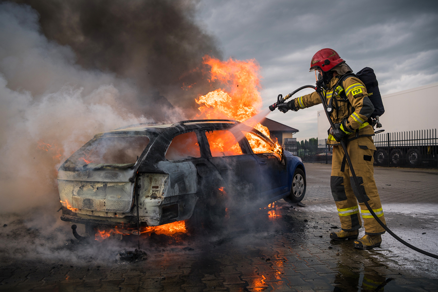Po przybyciu na miejsce zastano samochód osobowy Skoda Octavia, który w całości był objęty pożarem. W rozmowie z kierującym ustalono, że po zauważeniu oznak pożaru podczas jazdy zjechał na parking oraz podjął nieskuteczną próbę gaszenia pojazdu gaśnicą proszkową. Mężczyzna nie wymagał pomocy medycznej.