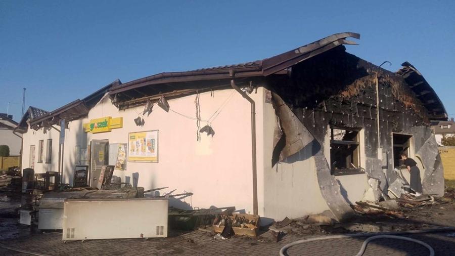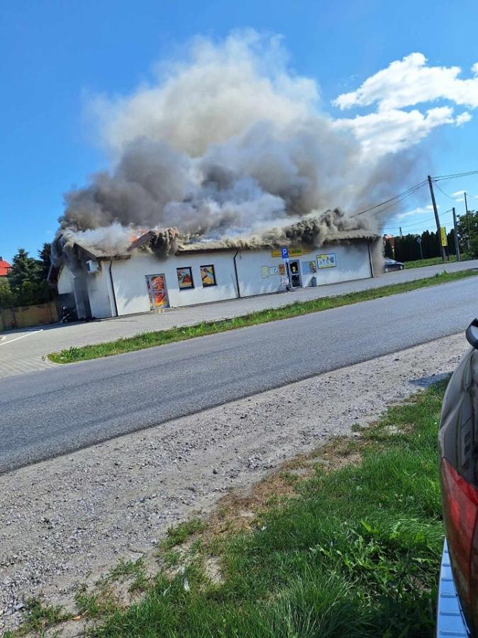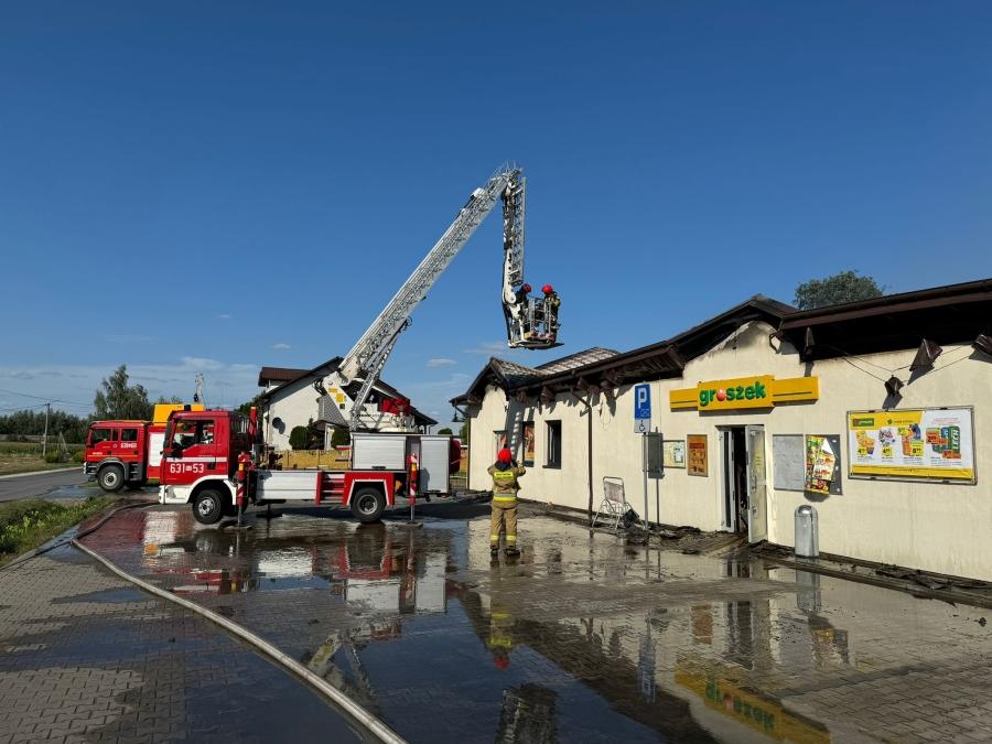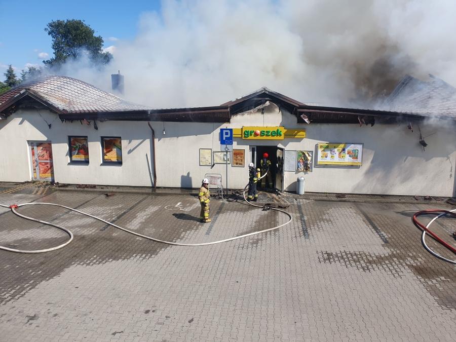 W chwili przybycia zastępów pożar w całości obejmował dach budynku o wymiarach około 13x25 metrów. Z otrzymanych informacji wynikało, że wszystkie osoby przebywające w sklepie ewakuowały się przed przybyciem straży pożarnej.