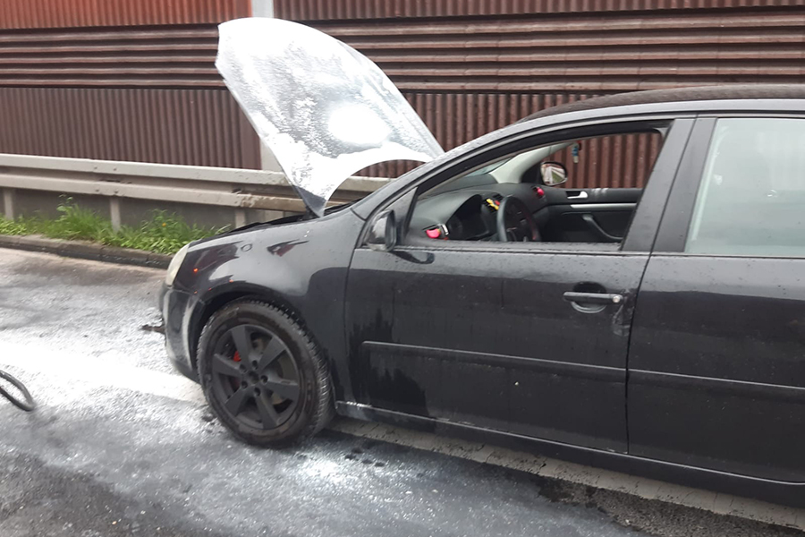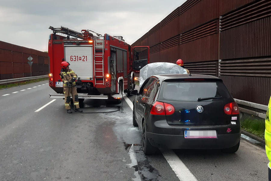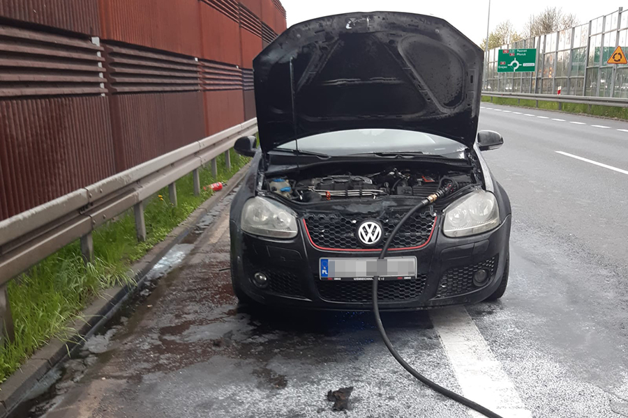 Po przybyciu na miejsce zdarzenia stwierdzono, że pożar powstał w komorze silnika samochodu osobowego marki Volkswagen i został opanowany przez osobę kierującą pojazdem przed przybyciem straży pożarnej.