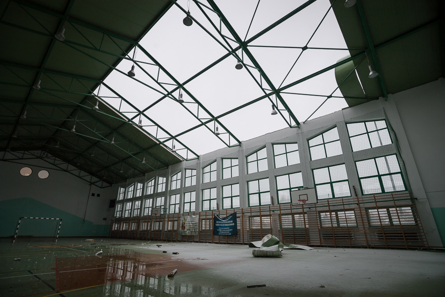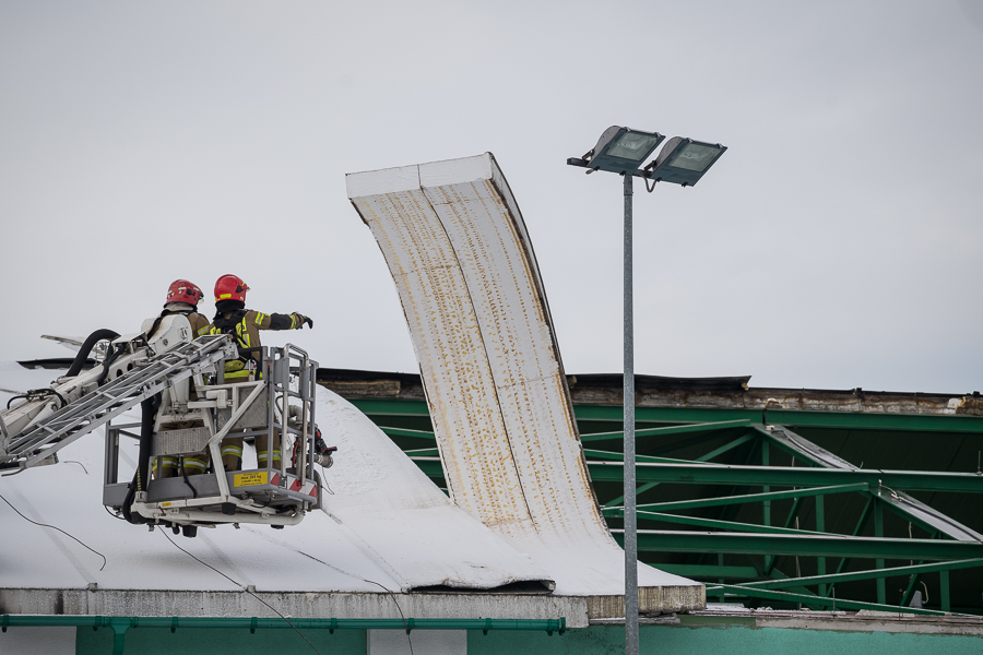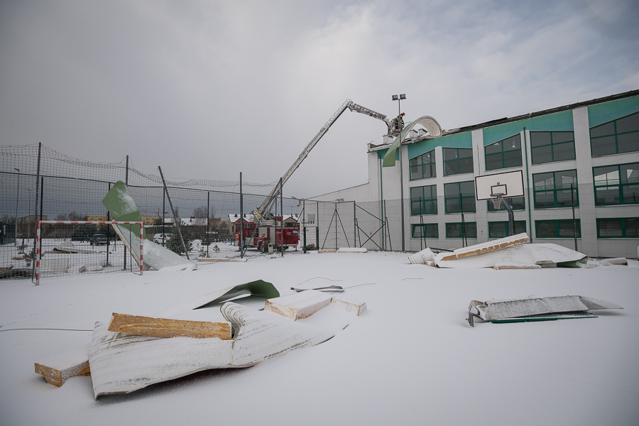 - zerwany fragment dachu na powierzchni ok. 300 m2 na sali gimnastycznej przy budynku Szkoły Podstawowej Nr 6 w Sochaczewie,