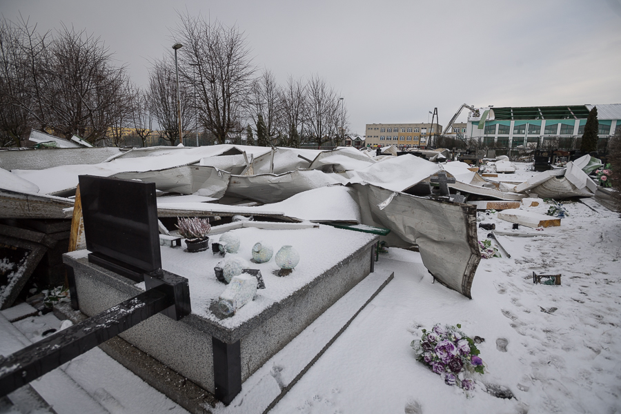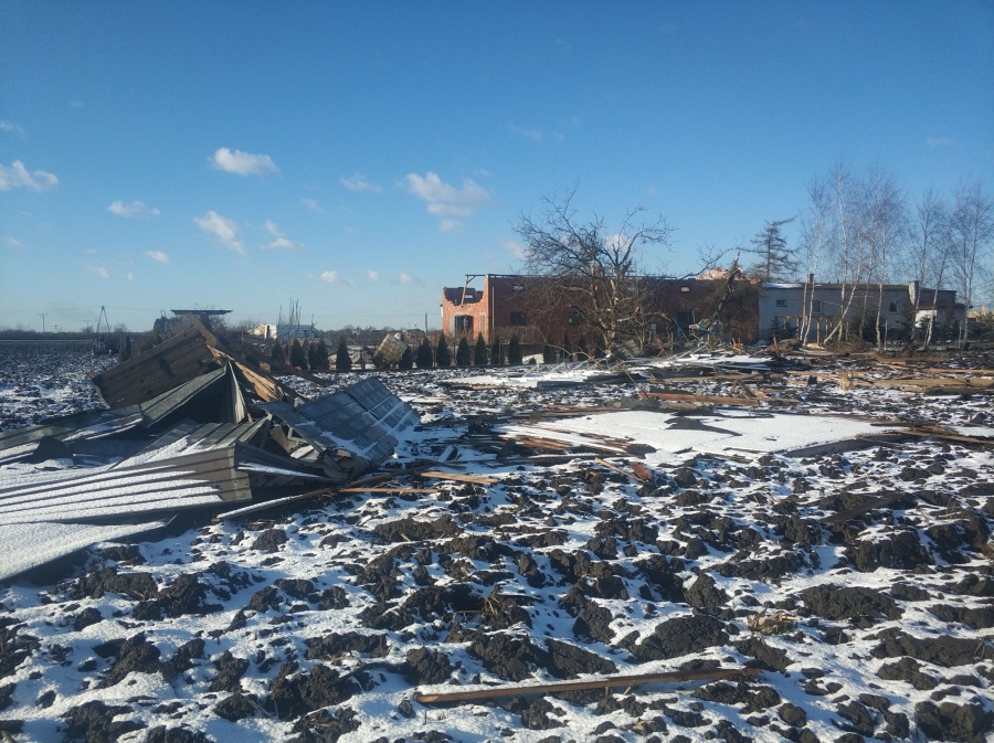 - uszkodzone bądź zniszczone dachy na 6 budynkach mieszkalnych,