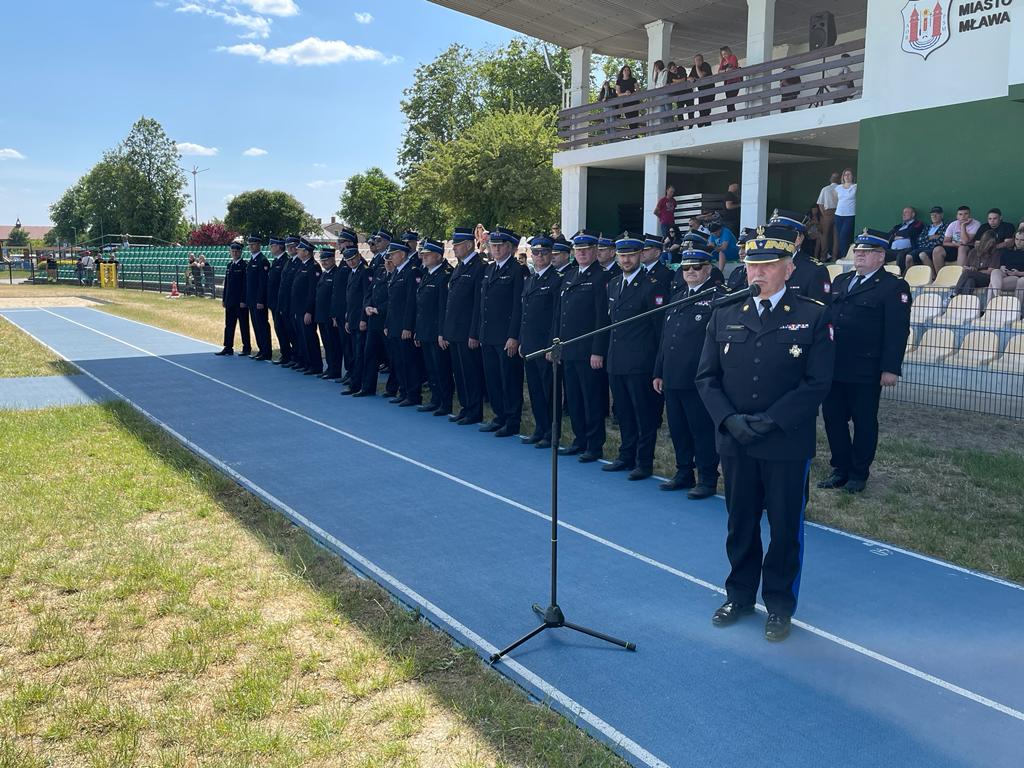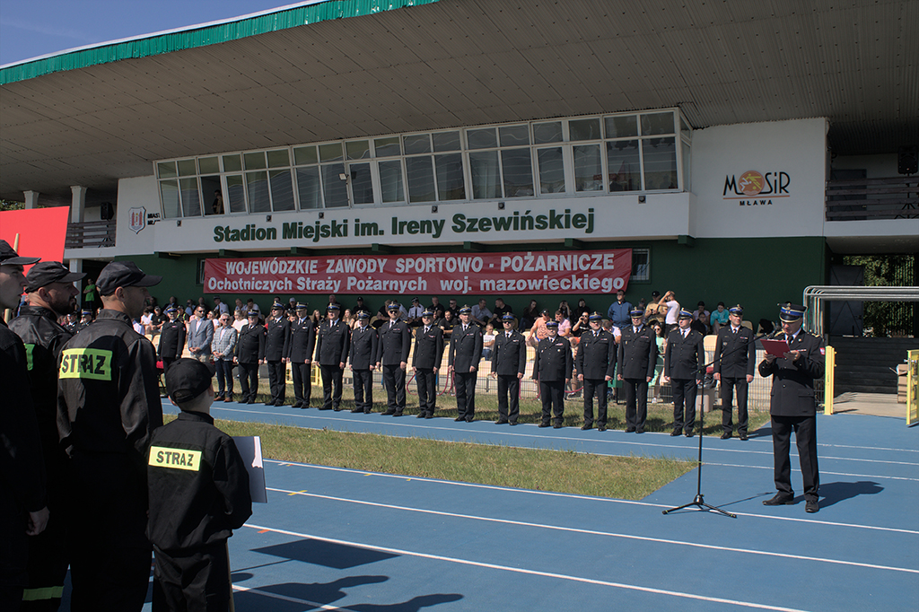 Na zakończenie uroczystości zaproszeni goście wygłosili mowy okolicznościowe. Jako pierwszy głos zabrał nadbryg. Jarosław Piotrowski, podkreślając rolę sportu pożarniczego w kształtowaniu sprawności i umiejętności druhen i druhów, które następnie wykorzystują podczas działań ratowniczo-gaśniczych. Szef Mazowieckiego Garnizonu podziękował w imieniu Sekretarza Stanu w Ministerstwie Spraw Wewnętrznych i Administracji Pana Macieja Wąsika oraz własnym wszystkim zaproszonym gościom, organizatorom, kibicom, a przede wszystkim uczestnikom dzisiejszych rozgrywek, za udział w zawodach wojewódzkich, zapewnienie wielu pozytywnych emocji oraz ducha sportowej rywalizacji. Następnie głos zabrał Wiceprezes Zarządu Oddziału Wojewódzkiego Związku Ochotniczych Straży Pożarnych RP druh Włodzimierz Wojnarowski, który podkreślił wzorową współpracę Komendy Powiatowej PSP w Mławie z jednostkami OSP i również podziękował wszystkim przybyłym za tak liczną obecność i rywalizację fair play.