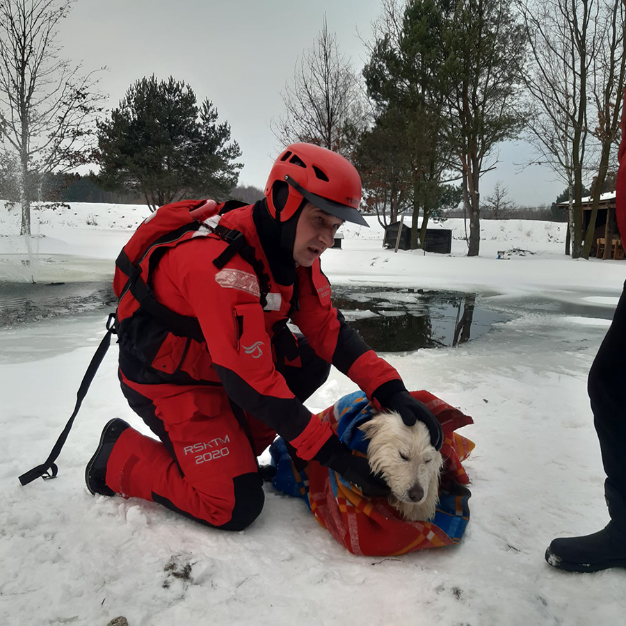 Po dojeździe strażacy potwierdzili informacje przekazane w zgłoszeniu. Ratownicy w kombinezonach do pracy w wodzie, z odpowiednim zabezpieczeniem dotarli do czworonoga, którego bezpiecznie ewakuowali na brzeg. Po ogrzaniu został on przekazany pod opiekę lekarza weterynarii.
