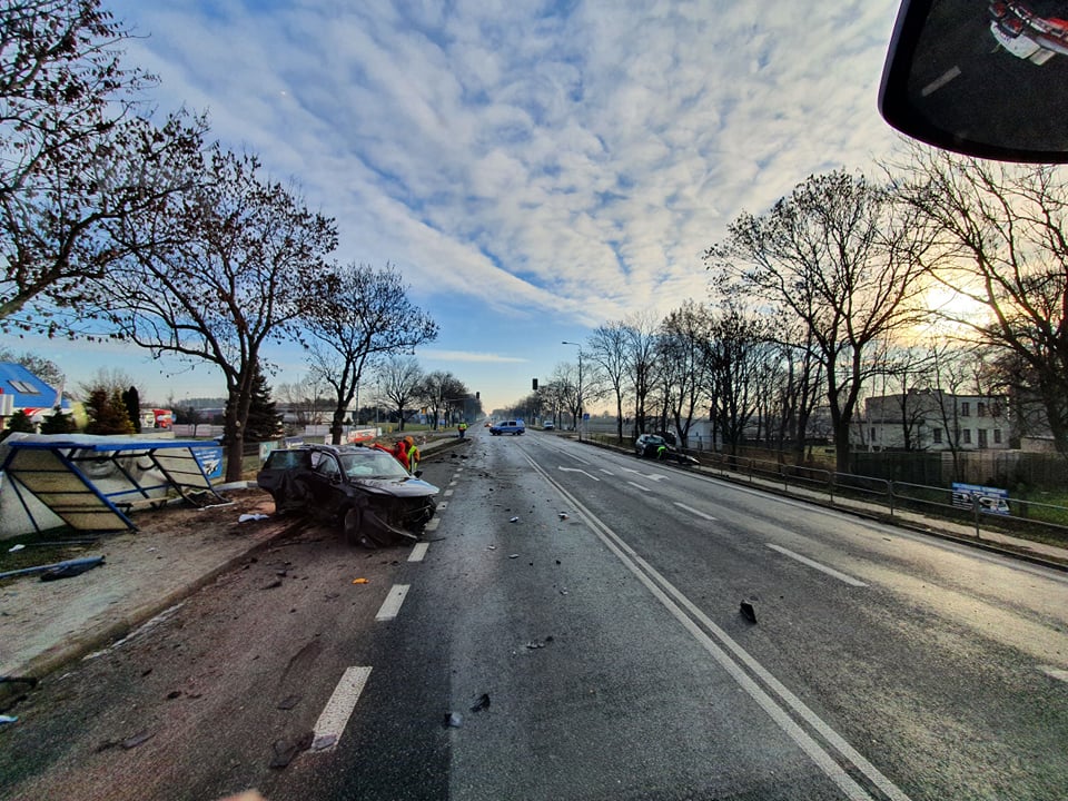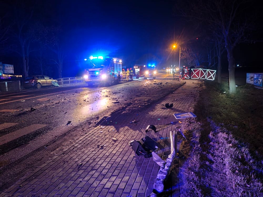 Po dojeździe ustalono, że doszło do czołowego zderzenia samochodów osobowych Volkswagen Touareg oraz Kia Ceed, które po zderzeniu znalazły się po przeciwległych stronach jezdni. Pierwszym z aut podróżowały trzy osoby - dwie wysiadły o własnych siłach, natomiast trzecia pozostawała bez funkcji życiowych przygnieciona pod rozbitym pojazdem. Drugim z aut podróżowała tylko kierująca, która pozostawała przytomna wewnątrz samochodu. W wyniku zderzenia zniszczeniu uległa sygnalizacja świetlna, latarnia, bariery drogowe oraz przystanek autobusowy.