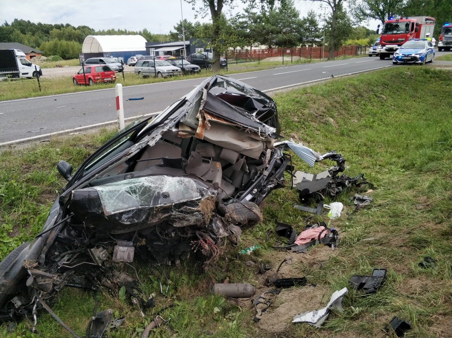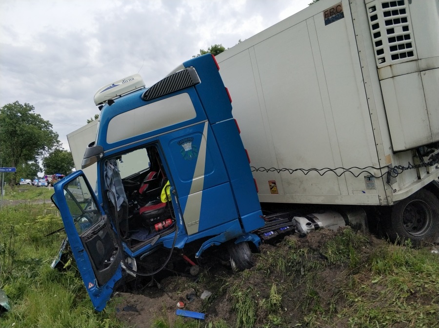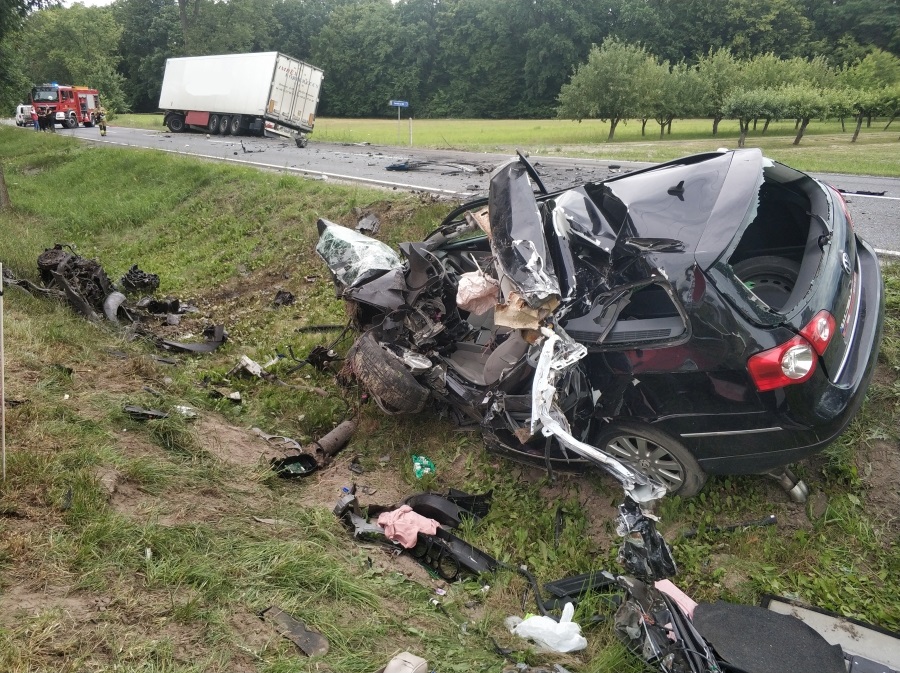 Po dojeździe stwierdzono, że doszło do zderzenia samochodu osobowego Volkswagen Passat z ciągnikiem siodłowym Volvo sprzężonym z naczepą typu chłodnia. Pojazdami podróżowali wyłącznie kierujący. W pierwszym z pojazdów pozostawała kierująca bez funkcji życiowych, zaś kierowca samochodu ciężarowego wysiadł o własnych siłach. Ponadto z uszkodzonych zbiorników ciągnika siodłowego nastąpił wyciek oleju napędowego.