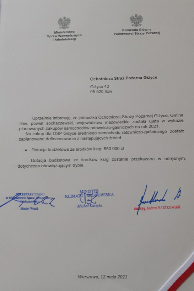 Wśród jednostek, które otrzymały promesy na zakup nowych samochodów, znalazła się Ochotnicza Straż Pożarna w Giżycach. Jednostka otrzymała dotację budżetową ze środków ksrg w wysokości 550 000zł.