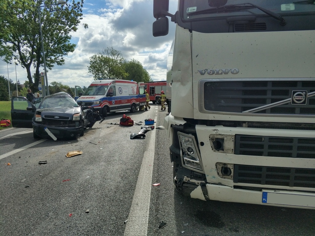 Po dojeździe na miejsce ustalono, że w zdarzeniu uczestniczyły dwa samochody ciężarowe marki Volvo oraz samochód osobowy Ford Fusion. Wewnątrz rozbitego samochodu osobowego pozostawał nieprzytomny kierujący. Kierowcy ciągników siodłowych wysiedli o własnych siłach i nie odnieśli żadnych obrażeń.