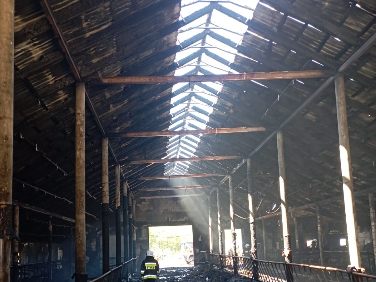 Do zdarzenia zadysponowano 2 zastępy z JRG Sokółka i Posterunku JRG Sokółka w Dąbrowie Białostockiej oraz zastępy gaśnicze z najbliższych OSP z terenu gminy Suchowola. Po przybyciu na miejsce zdarzenia pierwszego zastępu z OSP Suchowola stwierdzono pożar wnętrza obory murowanej krytej blachą na całej powierzchni wynoszącej około 1200 m2. W trakcie rozpoznania ustalono, że wewnątrz panuje dyże zadymienie, budynek wyposażony w instalację fotowoltaiczną PV, w obiekcie hodowano łącznie około 160 szt. bydła (krowy mleczne) - do czasu przyjazdu jednostek straży właściciele z pomocą osób postronnych ewakuowali około 30 szt. zwierząt.