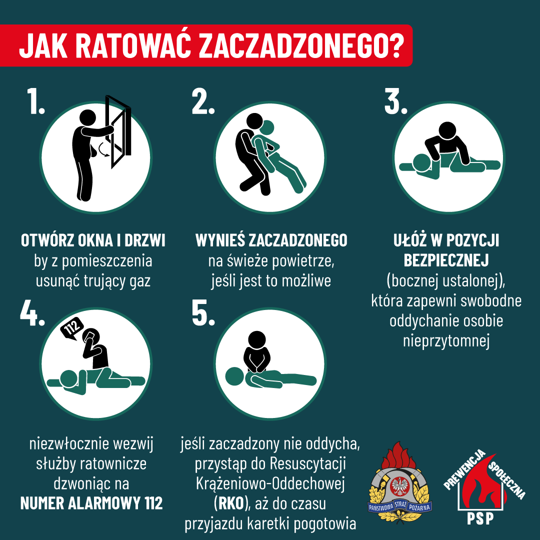 Ból i zawroty głowy, duszność, senność, osłabienie, przyspieszone tętno. W razie podejrzenia zatrucia trzeba natychmiast przewietrzyć pomieszczenie, ewakuować domowników i wezwać pomoc pod numerem 112.