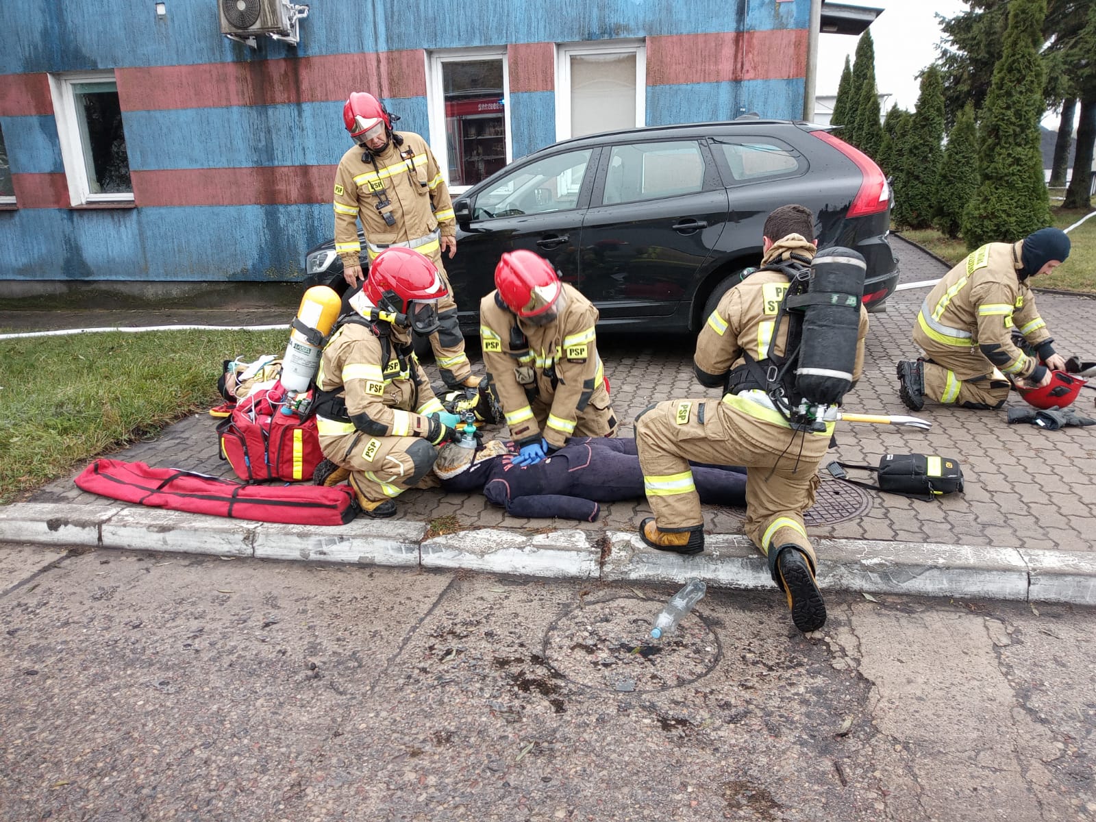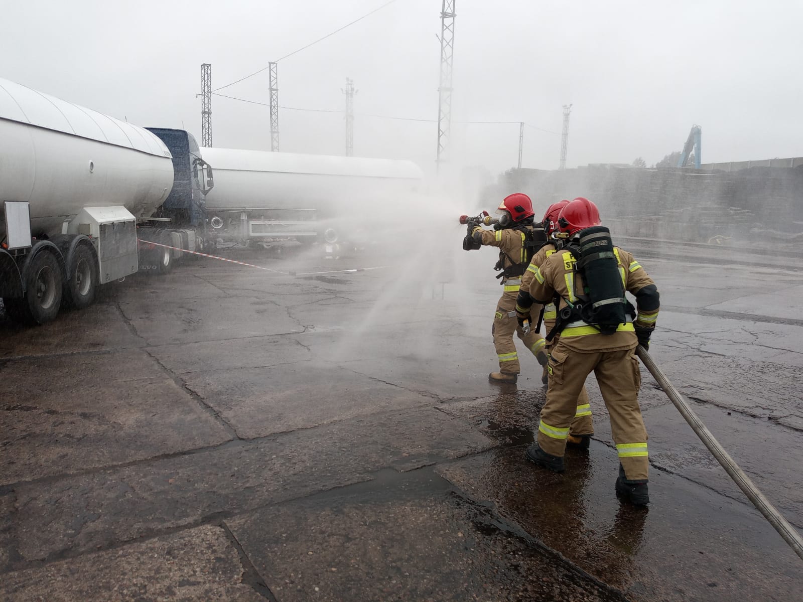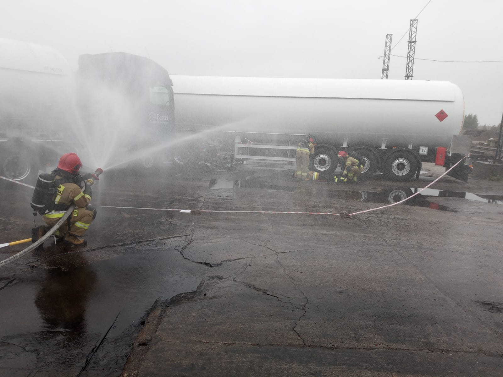 Przybyłe na miejsce zdarzenia jednostki straży pożarnej otrzymują zadanie natychmiastowej i bezpiecznej ewakuacji osób poszkodowanych ze strefy zagrożenia i udzielenie kwalifikowanej pierwszej pomocy, podanie 3 prądów wody z działek przenośnych celem chłodzenia przegrzanego zbiornika autocysterny do czasu wypalenia gazu oraz zorganizowanie zaopatrzenia wodnego zapewniającego ciągłość podawania wody. Natomiast przybyłe na miejsce zdarzenia służby współdziałające, tj. Policja, Straż Graniczna i Straż Miejska zabezpieczają drogi dojazdowe oraz teren prowadzonych działań. Dodatkowo w związku z realnym zagrożeniem rozprzestrzenienia się zdarzenia na obszary położone poza terenem zakładu w przypadku niekorzystnego rozwoju sytuacji – Kierujący Działaniem Ratowniczym z ramienia PSP podejmuje decyzję o konieczności ostrzegania okolicznych mieszkańców o zagrożeniu – zdanie realizują służby współdziałające obecne na miejscu zdarzenia.