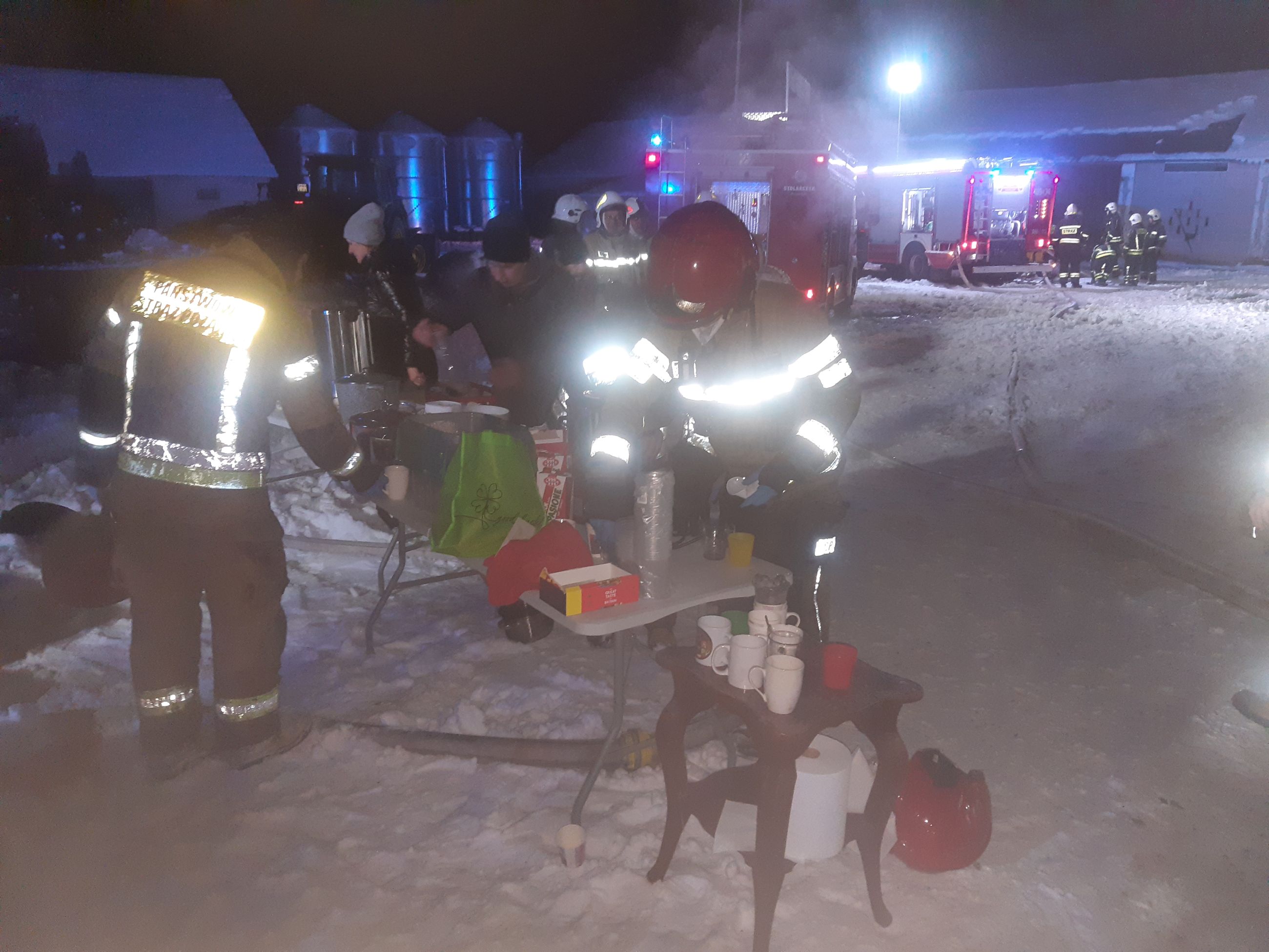 Po przybyciu na miejsce zdarzenia zastępów PSP przystąpiono do ewakuacji z parteru budynku maszyn rolniczych. Dodatkowo na miejsce zdarzenia zadysponowano ładowacz teleskopowy z OSP KSRG Reszkowce do działań związanych z rozbiórką konstrukcji dachowej oraz wywożenia słomy. Na miejsce zdarzenia udał się zastępca Komendanta Powiatowego PSP w Sokółce. Po usunięciu konstrukcji dachowej oraz przeprowadzeniu częściowego wyburzenia elementów obiektu – przystąpiono do ręcznego wyrzucania na zewnątrz wszystkich palących się bel z żelbetowego stropu poddasza. Resztki wyrzuconych bel wywożono trzema ładowarkami na pobliską łąkę i przelewano wodą. Zorganizowano dodatkowe zaopatrzenie wodne poprzez dowożenie jej z sieci hydrantowej miejscowości Reszkowce oraz Holiki. W związku z dużym zapotrzebowaniem na wodę oraz długim czasem dowożenia wynikającym z warunków drogowych (śliska jezdnia), a także awariami pojazdów spowodowanymi niską temperaturą (zamarzanie układów wodnych) – zadysponowano dodatkowe pojazdy do dowożenia wody oraz cysternę z OSP KSRG Lipsk (powiat augustowski). Z uwagi na niską temperaturę (około minus 14 st. C) mieszkańcy wsi zapewnili ratownikom JOP ciepłe napoje i posiłek oraz możliwość dogrzania się na bazie własnych obiektów.