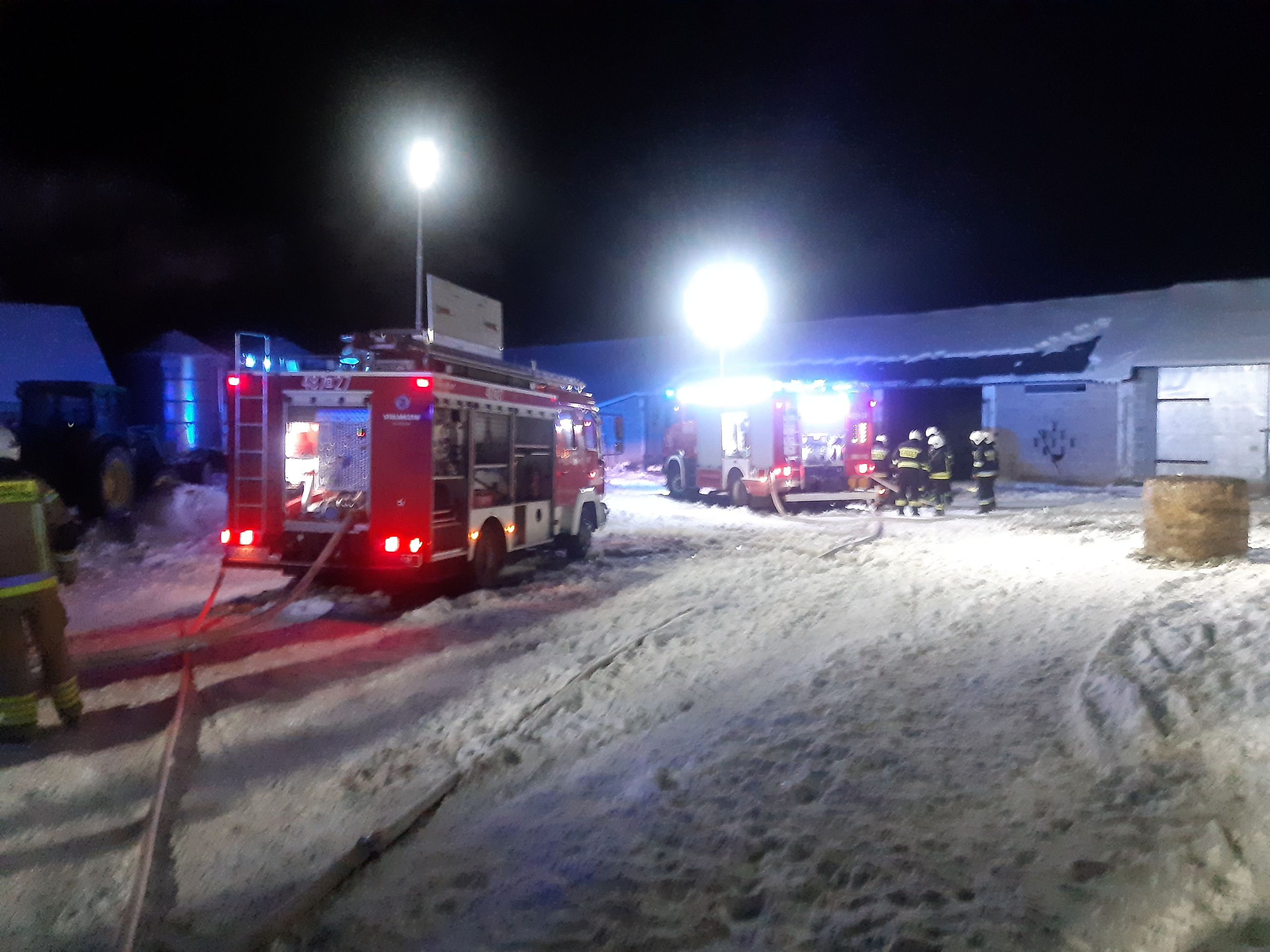 Do zdarzenia zadysponowano 2 zastępy z JRG Sokółka oraz zastępy gaśnicze z najbliższych OSP z terenu gminy Sidra, Janów i Dąbrowa Białostocka. Po przybyciu na miejsce zdarzenia pierwszego zastępu z OSP stwierdzono pożar poddasza budynku obory murowanej krytej blachą na powierzchni ponad 300 m2 – część konstrukcji dachowej uległa zawaleniu. W trakcie rozpoznania ustalono, że na poddaszu znajduje się około 150 szt. bel słomy, a wewnątrz obiektu maszyny rolnicze. Obiekt połączony z przybudówka o powierzchni około 250 m2, w której w momencie powstania pożaru znajdowało się bydło – zostało ewakuowanie przez właściciela z pomocą sąsiadów przed przybyciem straży.