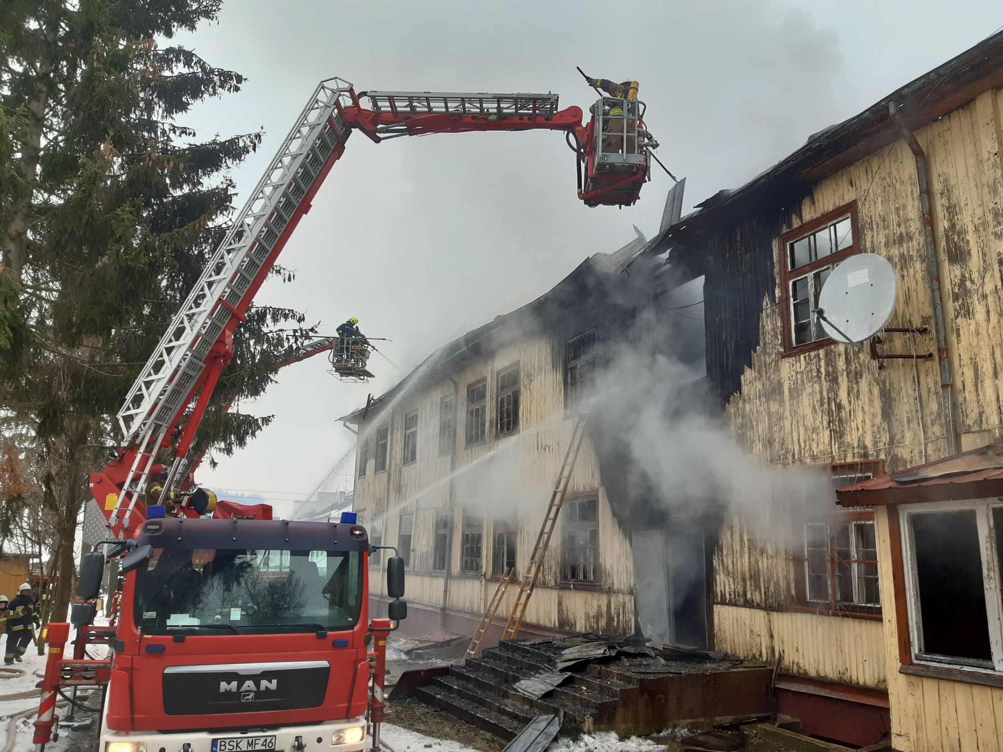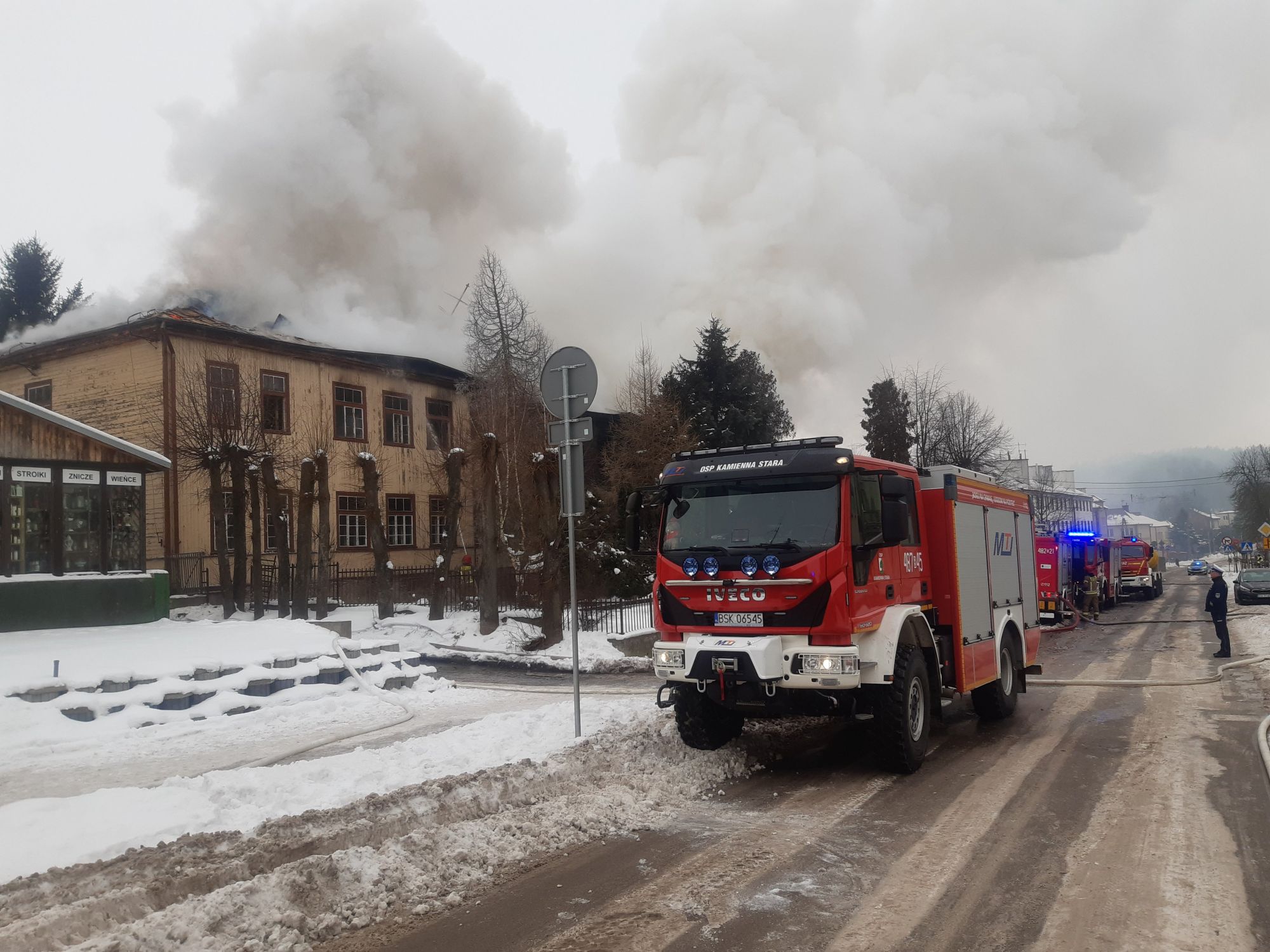 Po dojechaniu na miejsce zdarzenia stwierdzono, że pali się budynek nieużytkowanego domu kultury o konstrukcji drewnianej, dwukondygnacyjny, z poddaszem, kryty blachą o powierzchni ponad 500 m2. W chwili przybycia zastępu główna klatka schodowa była objęta ogniem, całkowicie zadymione było I piętro obiektu - dym wydobywał się przez dach i otwory okienne. Działania straży polegały na podaniu 1 prądu wody na palącą się klatkę schodową oraz zorganizowaniu zaopatrzenia wodnego. Do czasu zrealizowania rozwinięcia - pożar bardzo szybko się rozprzestrzenił wywnętrz drewnianego obiektu. Ogniem objęte zostało całe I piętro oraz poddasze. W związku z deficytem sił i środków dowodzący akcją (KDR) podjął decyzję o prowadzeniu w I kolejności działań w obronie pobliskich budynków usługowo - handlowych. SKKP Sokółka dysponuje na miejsce zdarzenia dodatkowe siły i środki z JRG Sokółka oraz jednostek OSP gminy Dąbrowa Białostocka i gmin sąsiednich. Nas miejsce zdarzenia samochodem SLRR udaje się Zastępca Dowódcy JRG Sokółka. Z chwilą dojazdu na miejsce zdarzenia kolejnych zastępów - wprowadzone zostają kolejne prądy wody na palący się obiekt z poziomu ziemi oraz z drabin przystawnych przez okna na I piętro obiektu. Na parter obiektu wprowadzone zostają roty w aparatach OUO celem przeszukania - jednak z uwagi na szybko rozprzestrzeniający się pożar w kierunku parteru zostają one wycofane z uwagi na bezpieczeństwo ratowników. Do zdarzenia zostaje dodatkowo zadysponowany podnośnik SHD z OSP KSRG Lipsk (powiat augustowski). Na miejsce zdarzenia udaje się samochodem SLOp Grupa Operacyjna na czele z Zastępcą Komendanta Powiatowego PSP w Sokółce. W trakcie dalszego rozpoznania ustalono, że obiekt odłączony był od wszelkich mediów. Po przybyciu kolejnych sił i środków, dalsze działania polegają na podawaniu około 10 prądów wody z poziomu ziemi oraz z drabin przystawnych przez okna na I piętro obiektu oraz dach, a także na klatki schodowe. Dodatkowo podano 2 prądy wody w natarciu od tylnej strony obiektu na dach i poddasze z podnośników SHD. Zaopatrzenie wodne stanowią pobliskie 3 hydranty sieci miejskiej. W celu zapewnienia ciągłości podawania wody na miejsce pożaru zadysponowane zostają dodatkowe 2 cysterny z JRG 2 Białystok i OSP KSRG Lipsk, a także rozkładany zbiornik 13 m3 z OSP Dąbrowa Białostocka. Natomiast wytypowane zastępy skierowane zostają do dowożenia wody z miejscowości Stock zasilanej z innej hydroforni. W związku z brakiem możliwości dotarcia do połaci dachowej od strony ulicy przez podnośniki (obiekt oddalony od ulicy) – KDR podejmuje decyzję o zadysponowaniu drabiny mechanicznej SD 37 z JRG Białystok oraz ładowarki teleskopowej z OSP KSRG Reszkowce. Po przybyciu w/w sprzętu podano dodatkowo 2 prądy wody w natarciu na palące się poddasze. Celem zapewnienia możliwości ładowania butli powietrznych w aparatach ochrony układu oddechowego zadysponowano do siedziby PJRG Dąbrowa Białostocka zastęp SCKn z kontenerem OUO z JRG Białystok. Natomiast w celu monitorowania sytuacji z powietrza do działań zadysponowano Grupę Dronową z OSP KSRG Olsza – obraz przekazywany był na żywo do stanowisk kierowania KP PSP Sokółka oraz KW PSP Biaystok. W związku z dużym zadymieniem sprawdzono 3 sąsiednie budynki wielorodzinne wykrywaczem wielogazowym na obecność substancji niebezpiecznych – brak zagrożenia. W związku z długotrwałą akcją rozstawiono na terenie działań namiot pneumatyczny z ogrzewaniem do zapewnienia komforty termicznego ratownikom. Pracującym ratownikom została zapewniona przez samorząd gminy Dąbrowa Białostocka woda, ciepłe napoje oraz gorący posiłek. Dalsze działania polegały na zrywaniu elementów arkuszy blachy w celu dotarcia do wszystkich ognisk pożaru na poddaszu. Po ugaszeniu pożaru na poszczególnych kondygnacjach przystąpiono do oddymiania obiektu z użyciem wentylatorów oddymiających oraz przeszukania wnętrza obiektu - nie stwierdzono obecności żadnych osób. Dalsze działania polegały na prowadzeniu rozbiórki nadpalonych elementów konstrukcji dachowej i wyrzucania jej na zewnątrz oraz dogaszaniu pojawiających się zarzewi ognia - miejsca działań wskazywane były min. przez operatora Grupy Dronowej. Po ugaszeniu pożaru i przekazaniu miejsca zdarzenia o godz. 16:00 - na dozór w 3-godzinnych odstępach pozostawiano wytypowane zastępy OSP wspierane do godz. 22.00 Grupę Dronową. Około godz. 04:00 dozór przejął zastęp z Posterunku JRG Sokółka w Dąbrowie Białostockiej. Po dokonanym sprawdzeniu budynku z wykorzystaniem kamer termowizyjnych nie stwierdzono zarzewi ognia.