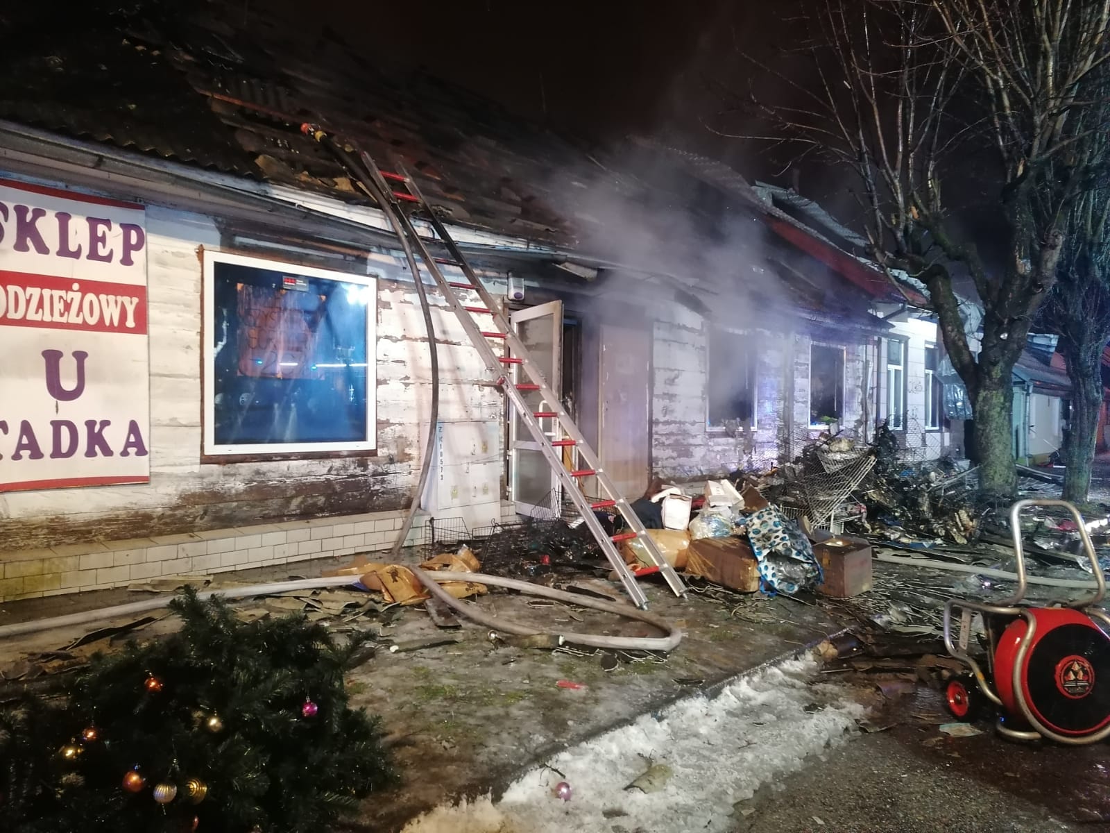 Po dojechaniu na miejsce zdarzenia stwierdzono pożar kompleksu budynków konstrukcji drewniano - murowanej. Płomienie wydostawały się na zewnątrz przez dach pokryty eternitem oraz blachą, wewnątrz panowało duże zadymienie. W trakcie rozpoznania ustalono, że w dwóch lokalach budynku prowadzono działalność handlową polegającą na sprzedaży odzieży oraz butów, trzeci lokal stanowił część magazynową, obiekt posiadał również wyodrębnione pomieszczenie mieszkalne. Osoba zamieszkująca budynek znajdowała się na zewnątrz, nie doznała żadnych obrażeń i nie potrzebowała pomocy medycznej.